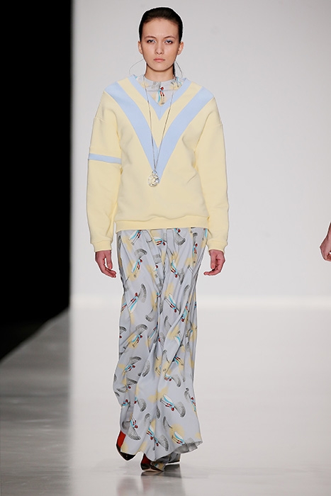 Принты с лыжницами, если почитать пресс-релиз — из европейских плакатов 50-х годов; а мне они ещё напомнили рисунки тканей 20-х — 30-х, всю эту производственную романтику. Рисунки Сергея Бурылина всегда интересно разглядывать; в самой идее делать узоры и гирлянды из спортсменов, трудящихся, из шестерёнок, тракторов и колосьев есть что-то глубоко барочное, несмотря на весь предполагаемый аскетизм и трудовое подвижничество тех, кто, по идее, должен был эти ткани носить.