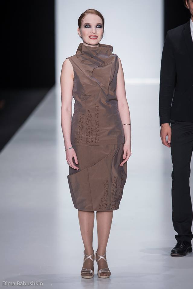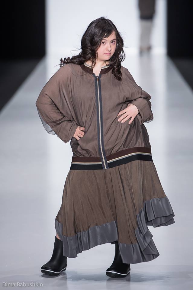 Коллекция Маши Шароевой «Пусть всегда будет солнце» — для людей с синдромом Дауна. От этой коллекции осталось очень приятное и цельное впечатление: мягкие ткани, коричневая гамма с мягкими переходами цвета, многослойность. На первый взгляд функционал этой одежды как у обычной, но учитывались особые пропорции «солнечных людей», и застёжки сделаны особенно удобными.
