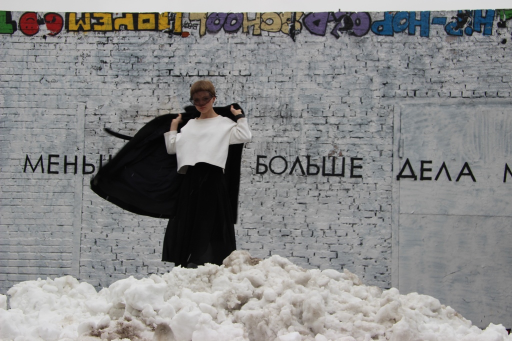 Головные уборы, полумаска и клатч — Нестор Соколов, пальто Cyrille Gassiline, топ Zara, балетная юбка для репетиций Grishko, челси Fouganza; фото — Нестор Соколов.