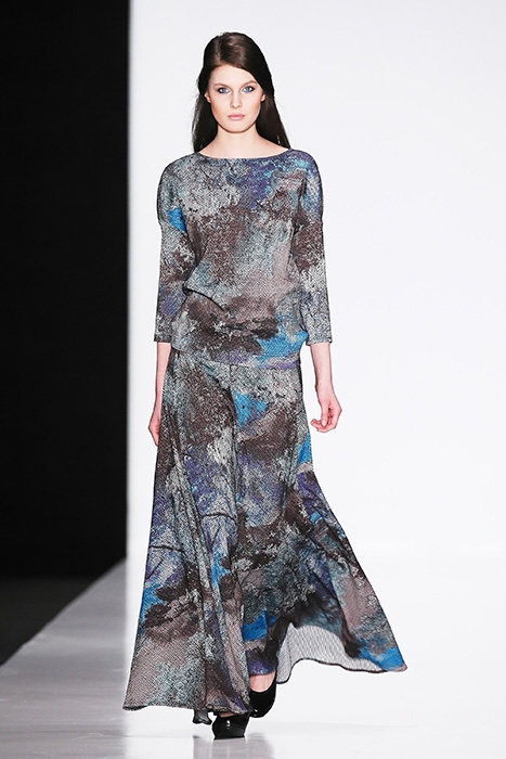 Лилия Пустовит. Платье с двумя принтами — просто любовь и мечта. Ретро-лыжницы издалека выглядят полевыми цветами. Мне нравится, как здесь соединяются принты, нравится рукав три четверти, нравится современность и свежесть облика в целом.