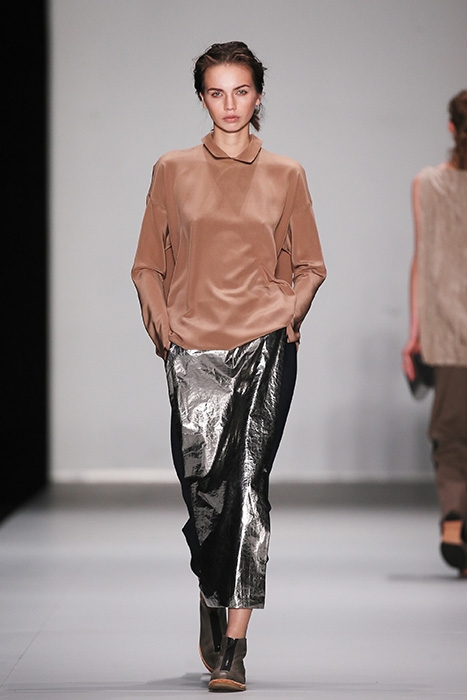 Яся Миночкина представила очень коммерческую, очень трендовую, современную и запоминающуюся коллекцию. Мне безумно понравились фактуры и их взаимодействие с формой; жесткость материалов совершенно не пугает, так как я имела возможность посмотреть и пощупать эти вещи на лекции в ЗИЛе. У них нежнейший шёлковый подклад, жесткая ткань только снаружи. Снаружи — графичность линий, внутри — кайфовые ощущения.