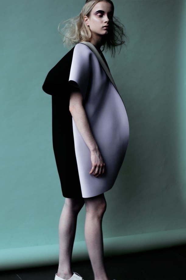 ЕА. Трикотаж достаточно текучий, он не держит форму. Мне было интересно попробовать что-то объёмное. Неопрен, который я использовала – отлично держит форму, и у него оказался очень подходящий цвет.