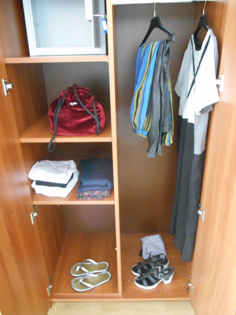 Содержимое серой сумки осваивается в шкафу.