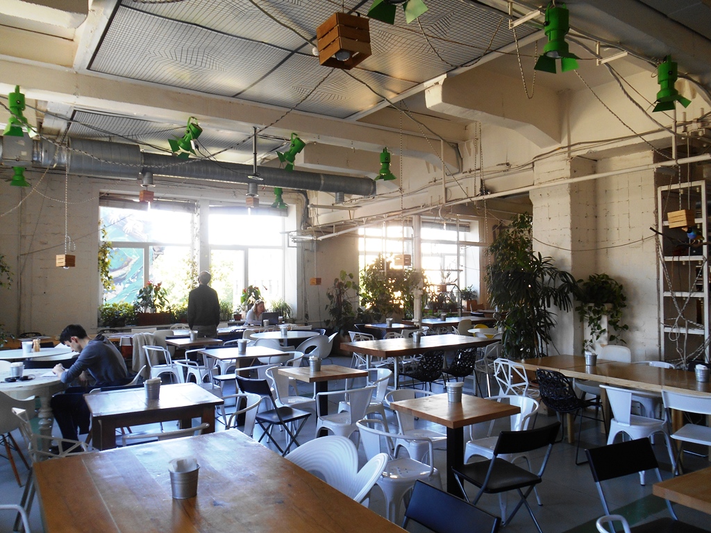 Кофейня «Зелёная комната». Именно в этом месте, как я узнала из меню, был раньше кондитерский цех, и делали тут «Птичье молоко»; вообще, все помещения «Этажей» — бывшие производственные, чем и объясняется индустриальное обаяние места и забавные названия комнат: «Тирамису», «Пряности», «Суфле», «Карамель».