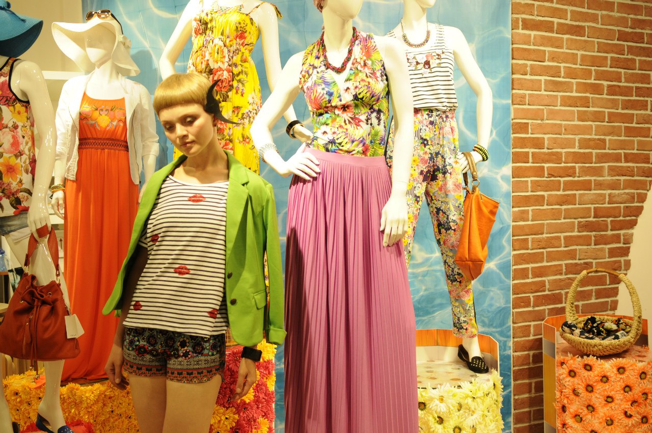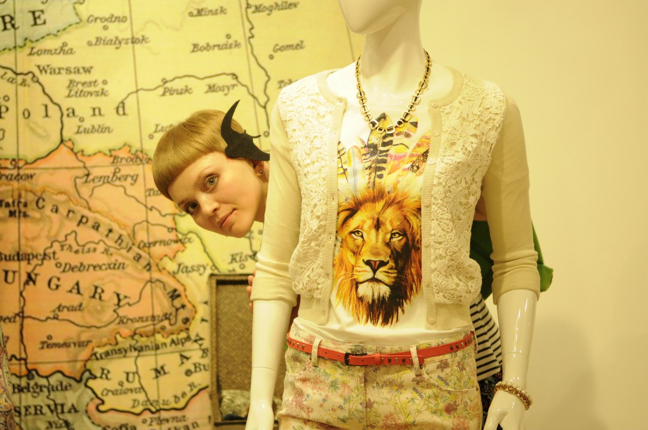 А пока — несколько фото, которые Даша сделала прямо в зале с витринами. Это, признаюсь, почти реализация одной странной детской мысли. Ещё когда я была маленькой, пространство витрины казалось мне частичкой другого мира. Это же фикция: искусственный снег, бумажные осенние листья, люди ненастоящие, всего этого нет; как театр, только неподвижный. И всегда было весело смотреть, как простая обыкновенная тётя продавец входит к манекенам и что-то на них поправляет; она была в этот момент как гость из другого измерения, земного, нашего. Я тоже побыла немного таким гостем.