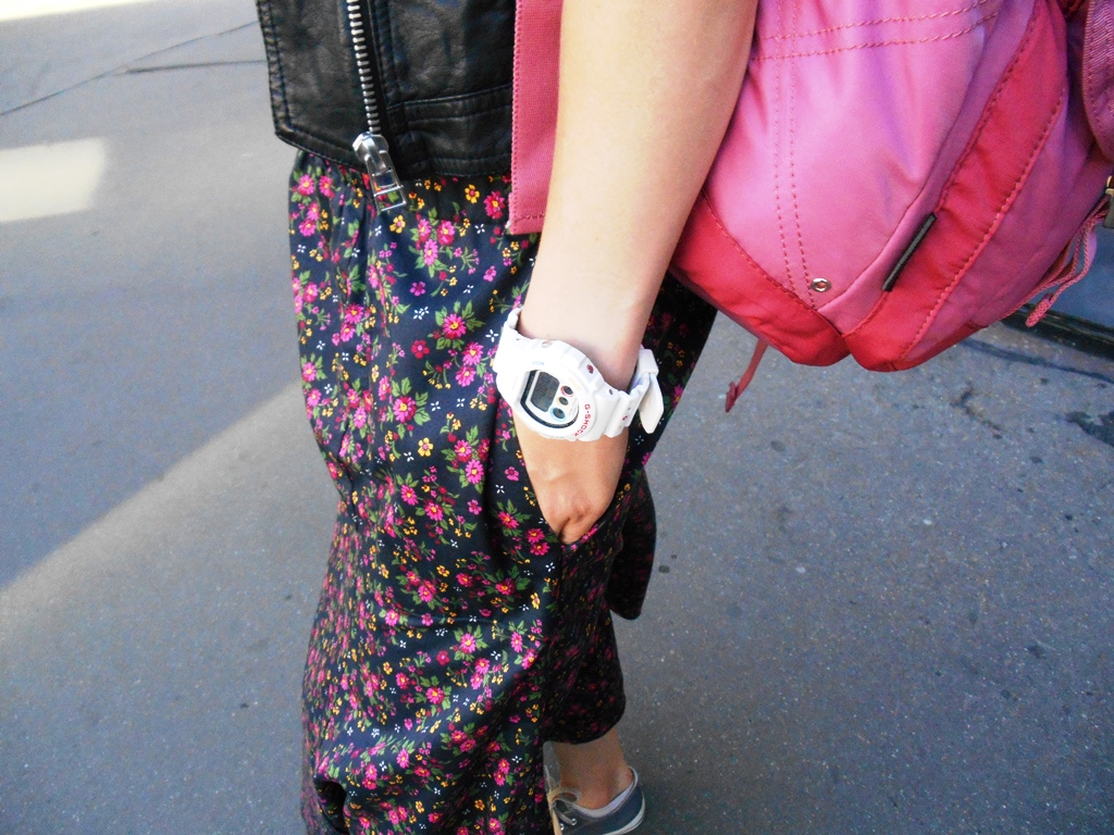 Юбка Cyrille Gassiline, жилет Sela, топ Zara, часы Casio G-Shock, рюкзак и кеды no name.