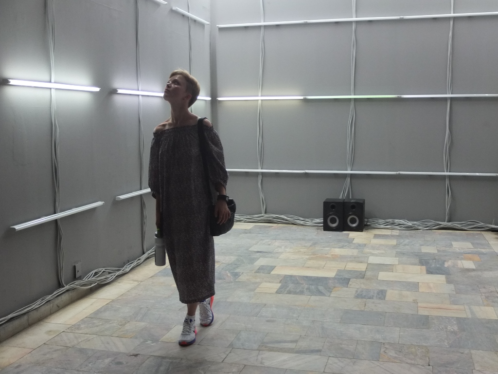 Потом мы со Светой svet_sezona пошли на выставку Lexus Hybrid Art на ВДНХ. Так же, как кроссовки меняют смысл, если соединить их с платьем, — весь лук в целом меняется, если поместить его в другой контекст.
