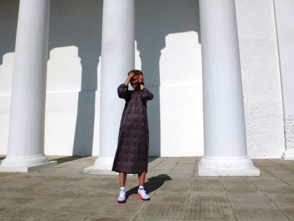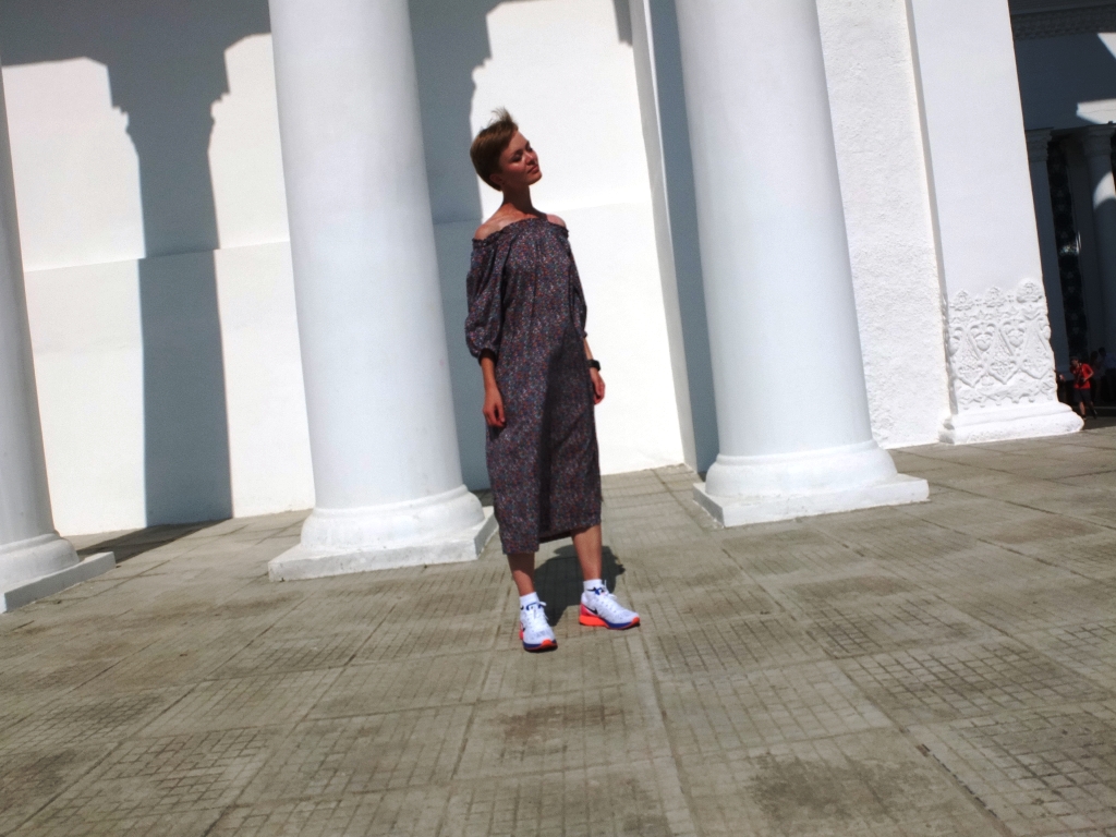 Платье Cyrille Gassiline, кроссовки Nike Lunarglide 6, очки Jeepers Peepers.
