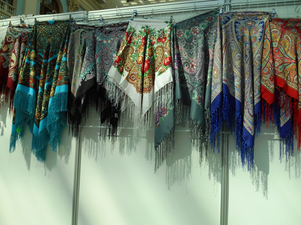 А вот поддельные павловопосадские платки. Что подделка — видно с пяти метров (я рисунки и колориты помню просто в лицо). На расстоянии метра очевидное становится вопиющим.