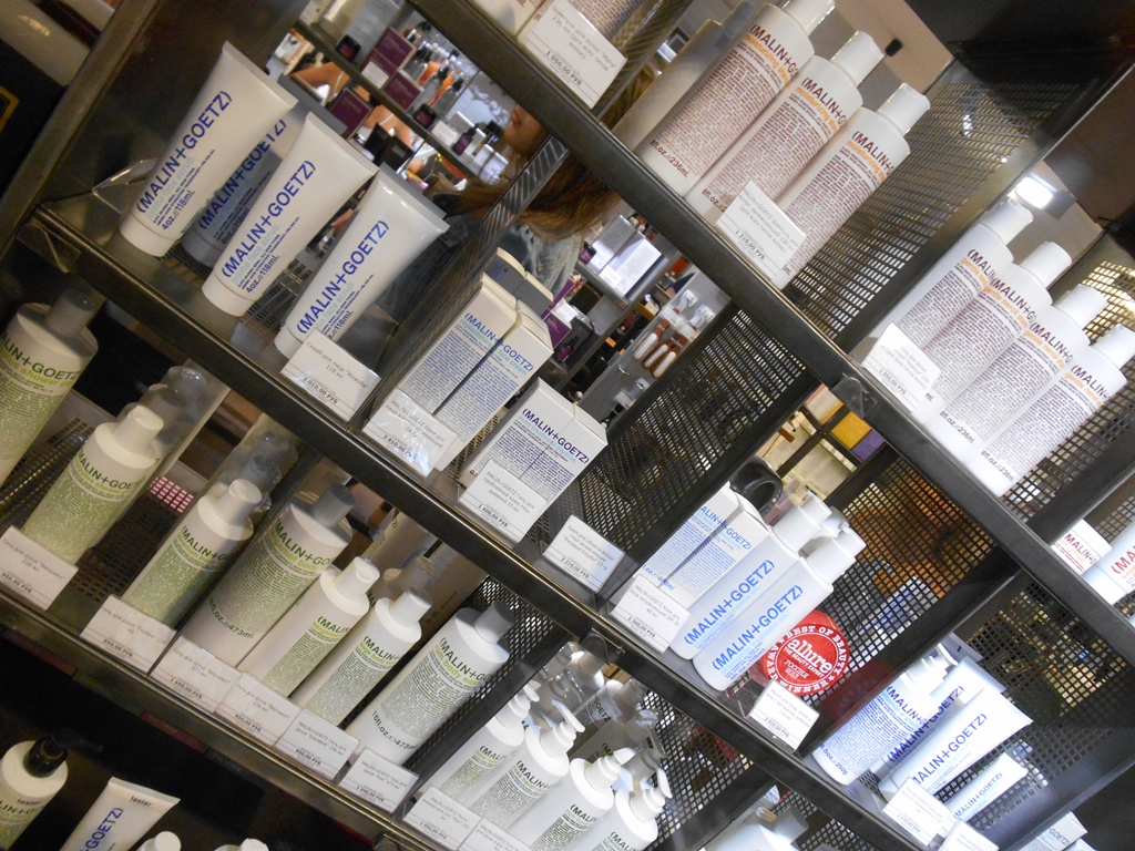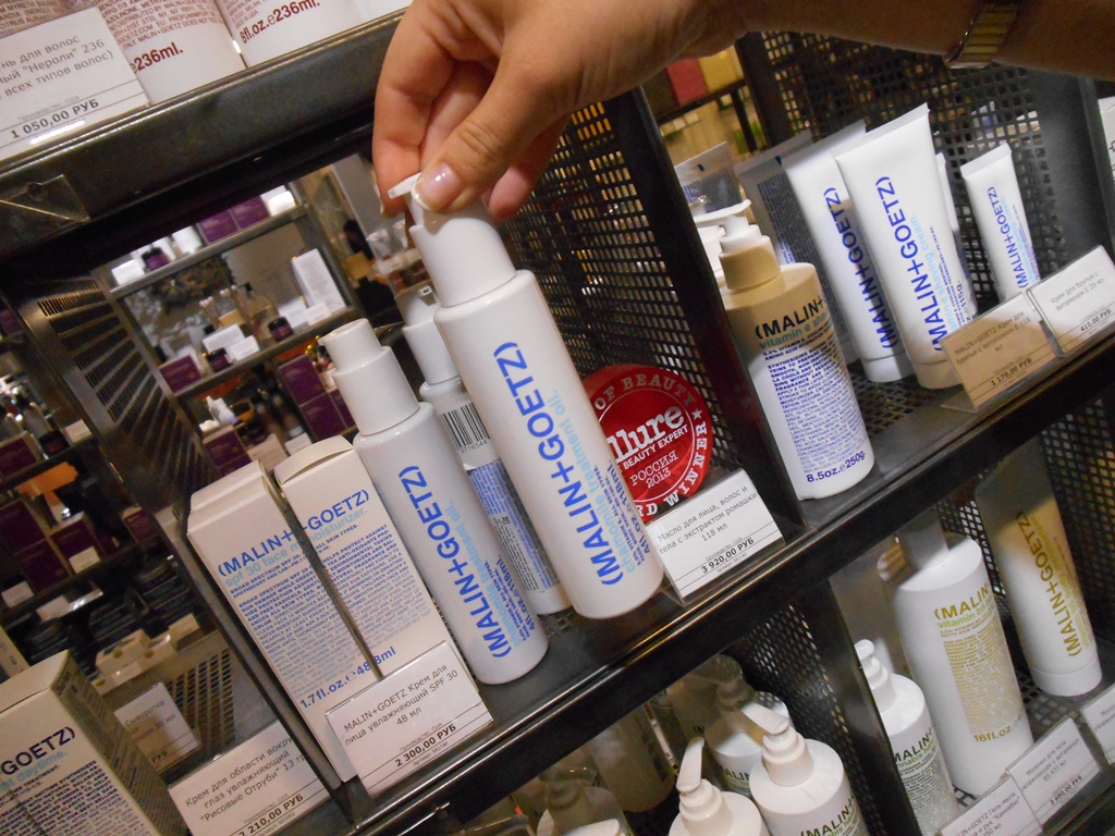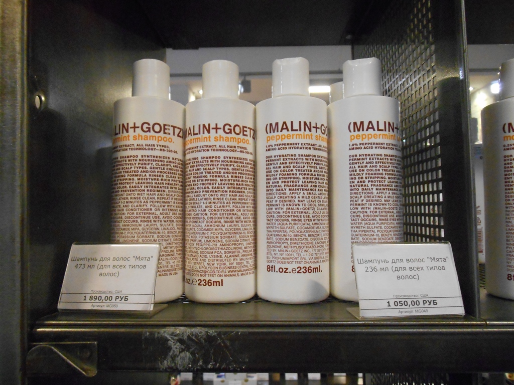 (Malin+Goetz) – это тоже ветераны «Космотеки», одна из первых марок-бестселлеров, признанных и покупателями, и журналами. Есть интересное цветовое разделение: волосы – красный цвет, лицо – синий, тело – зелёный.