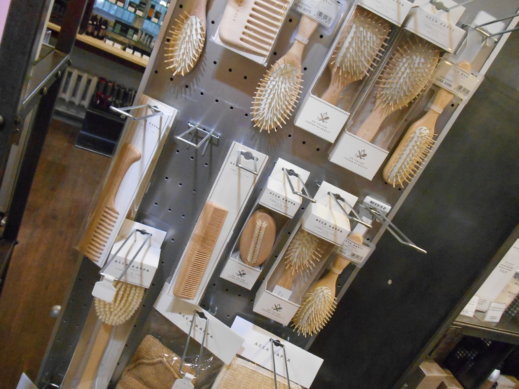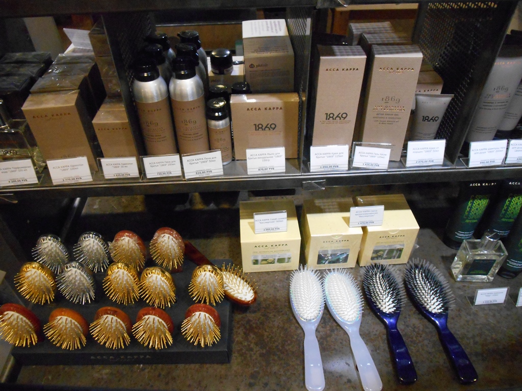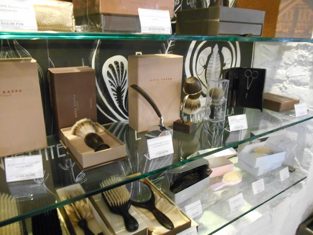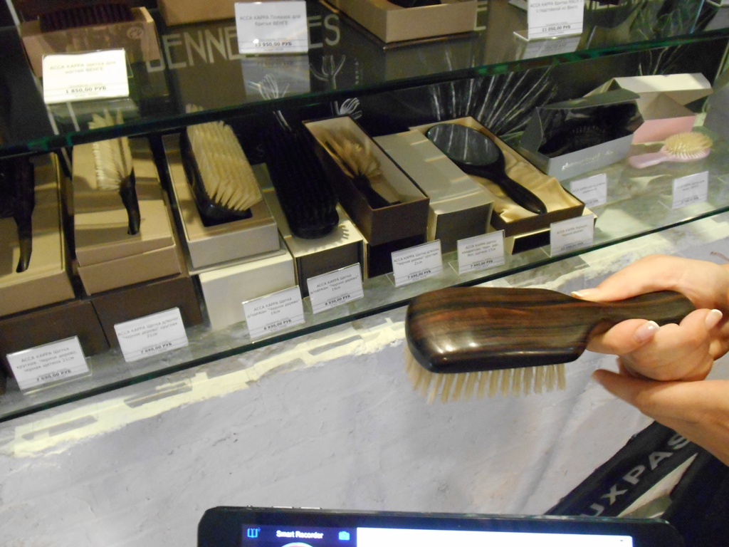 Линия «Белый мускус» подходит и мужчинам, и женщинам. Чем ещё знамениты Acca Cappa – расческами. Расчески есть и для профессионального, и для домашнего использования, и из ценных пород дерева. Помазок из шерсти барсука. Ещё они делают зубные щетки из натуральной щетины; их нужно менять чаще, чем обычные, по крайней мере раз в месяц. Зато натуральная щетина более мягкая.