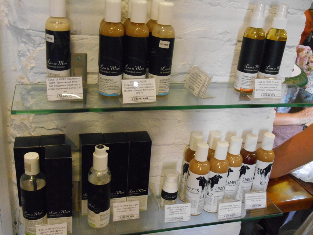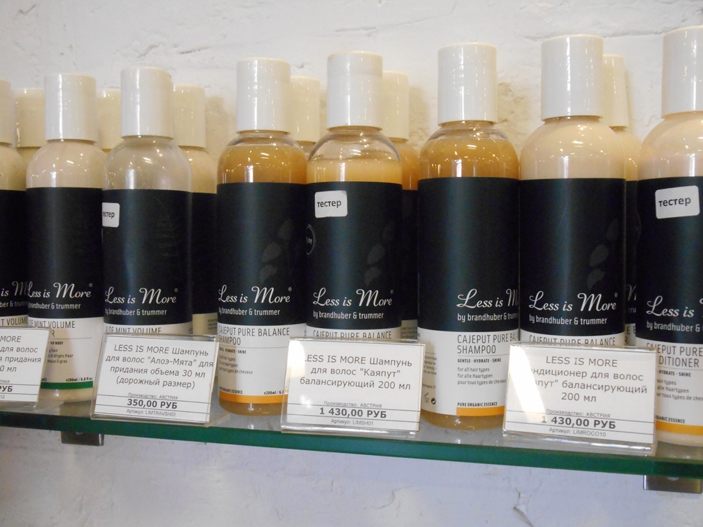 Less is More – органический уход за волосами. Это первая органическая салонная марка; они создали такую технологию, при которой на органике можно работать профессионально. Здесь представлены средства для разных типов волос, для стайлинга. Также у них есть средства для животных, для собак, например.