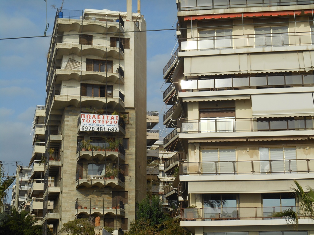 Вид на соседние дома, если посмотреть вправо. Типичные афинские детали фасада — балконы и террасы, на которых обязательно — наклонные маркизы от солнца. Они либо одинаковые на всём доме, либо сделаны так, что визуально не выбиваются. На моём окне — рольставни, они же при необходимости — маркиза.