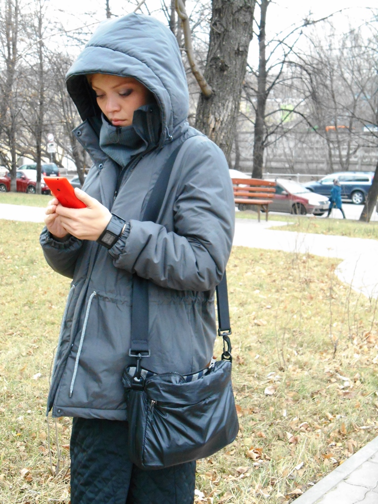Динины вещи вообще отличает продуманность и холодноватая практичность, в них всё на своём месте; поэтому мне самой кажется странной ассоциация «кокон» — ведь обычно так говорят про объёмные, бесформенные вещи, у Дины же — всё в струне. От кокона здесь, пожалуй, только объём, и ощутимый внутри этой вещи уют.