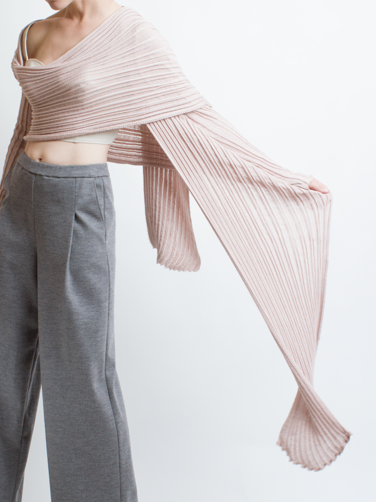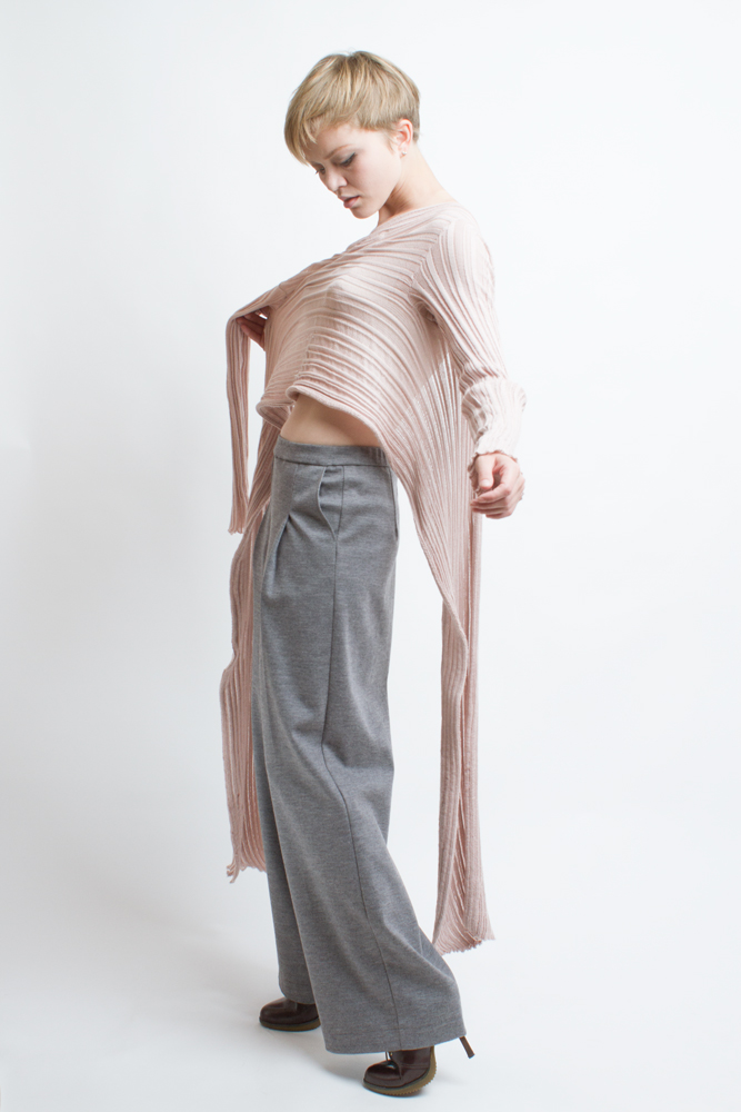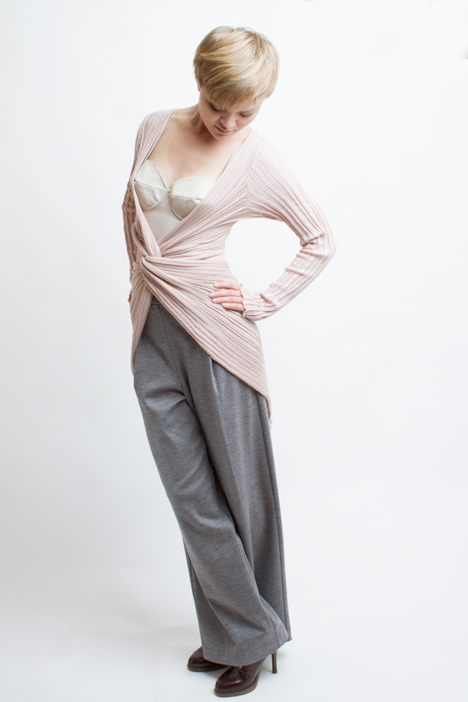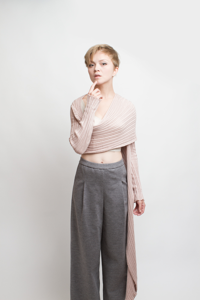 Иоанна Курбела делает очень достойный трикотаж как раз в этой неброской, с греческими акцентами, манере. Все вещи абсолютно носибельны; оттенки сдержанные, но без уныния. Кстати, я заметила, что у неё вообще нет случайных цветов. В каком-нибудь «Бенеттоне» можно увидеть целый стеллаж с трикотажем всех цветов радуги, а здесь — нет, в ход идут только самые удачные, безошибочные, при этом далеко не всегда самые очевидные оттенки. Я выбирала, к примеру, из насыщенного зеленовато-синего, тёмно-фиолетового и вот этого, балетно-розового. А были ещё, например, медно-красный, черный, и ещё один розовый — порозовее. Никаких желтеньких, травяных зелёных и противно-бирюзовых рядом не висело.
