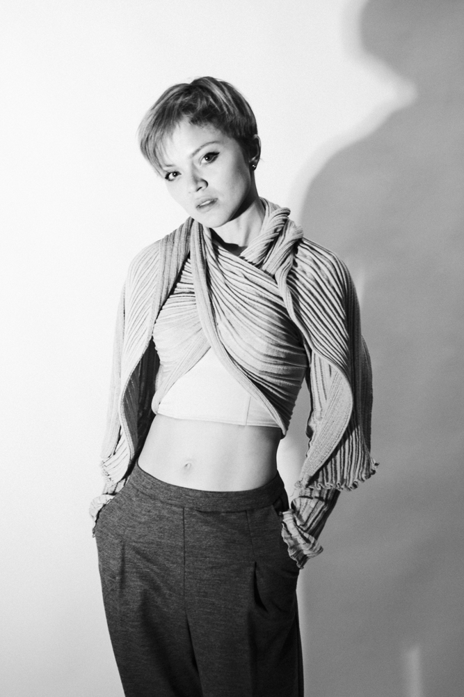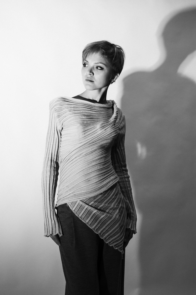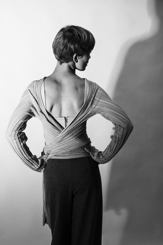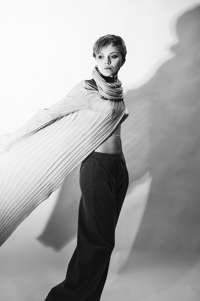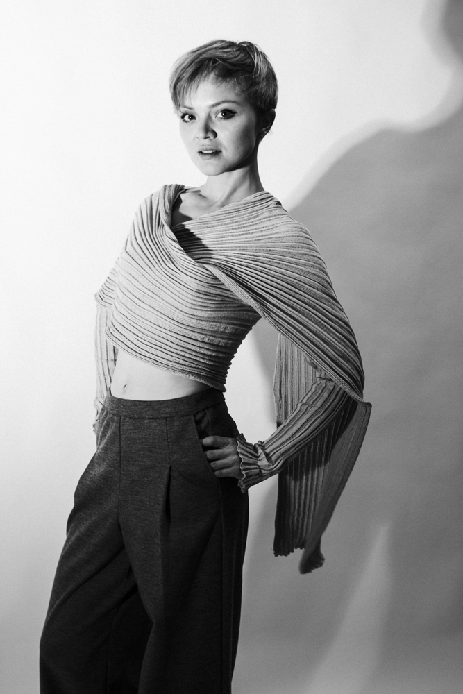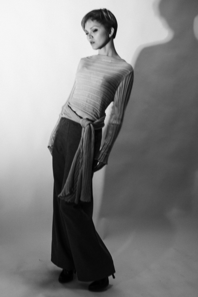 Кардиган Ioanna Kourbela, топ Cyrille Gassiline, брюки и пальто Ashe, ботильоны Dr Martens.