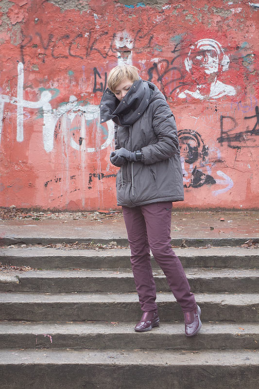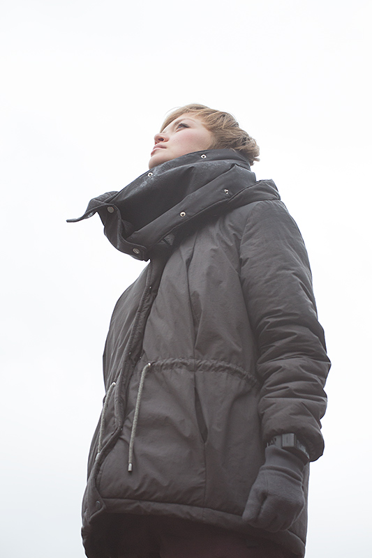 Случайно/неслучайно у меня подобралось несколько вещей, из которых вполне складывается скафандр для города. Сейчас я так и хожу: куртка Buttermilk Garments, шарф-воротник Intro.version (который выглядит деталью куртки, но ею не является, и его, кстати, можно носить поверх базовых вещей, делая их интереснее), теплые брюки Uniqlo и непромокаемые ботинки Nike.