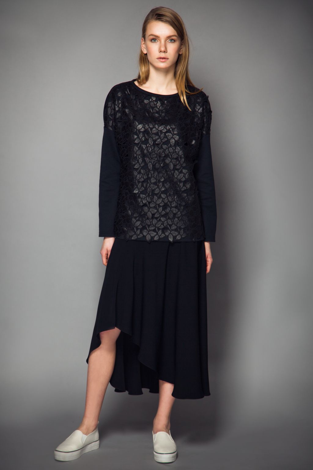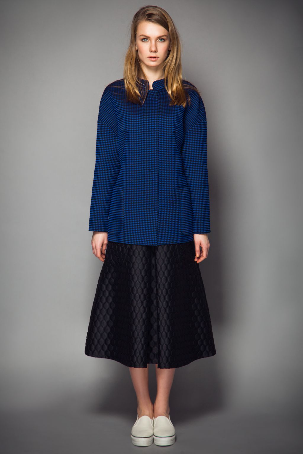 Много плотных тканей, много разных необычных фактур; ткани такие, что из сами по себе интересно разглядывать. Мой фаворит — серо-зелёная юбка из фактурной ткани с рисунком, напоминающим колотый лёд.