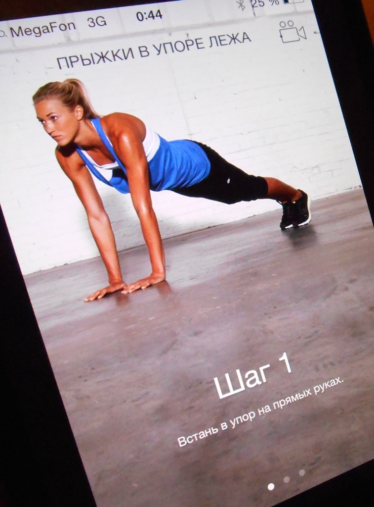 А здесь мы просто тягали блины в упоре. Я люблю это упражнение делать с гантелями, и в домашних тренировках оно мне часто попадается. Тем более что в приложении N+TC его показывает очень классная девушка-тренер. Если и есть ролевая модель в моих тренировках, то, пожалуй, вот она; именно так я бы хотела выглядеть.