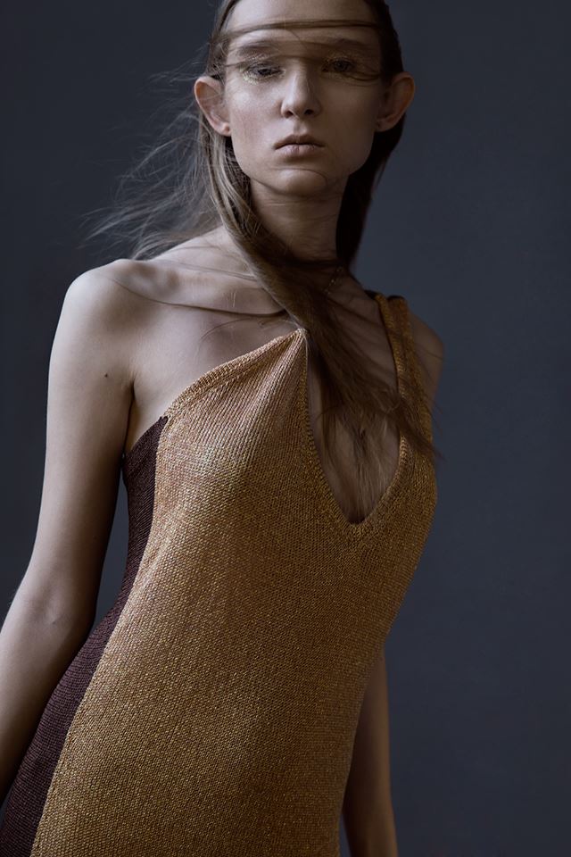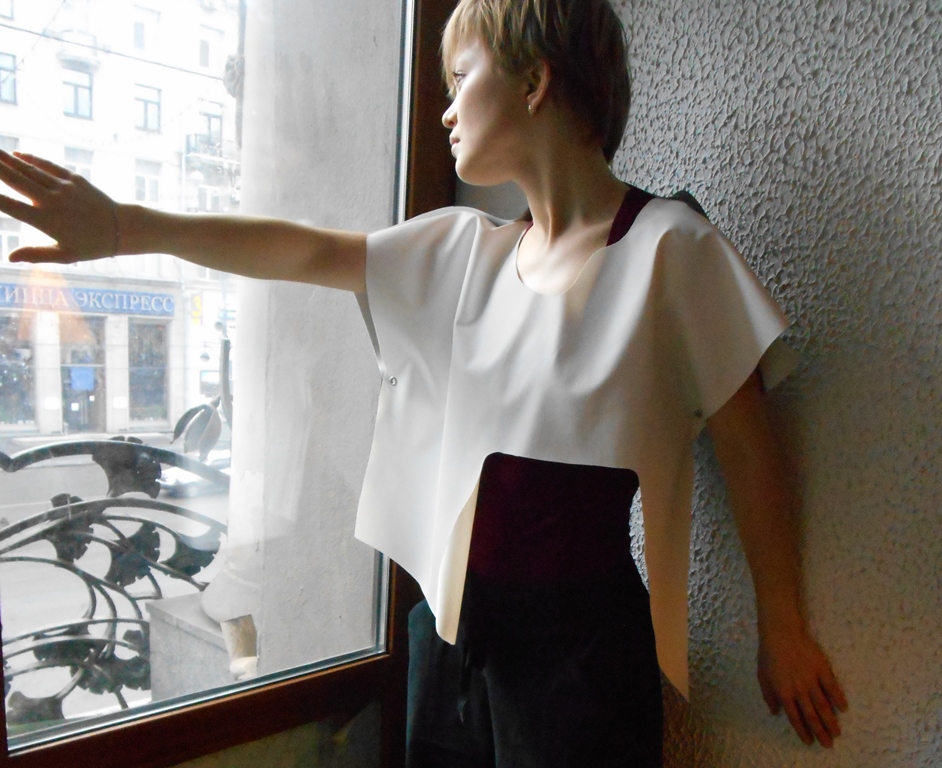 «Это супрематическая композиция из простых фигур, цвета движутся внутри форм. Когда надеваешь вещь на тело, она ведёт себя по-разному, принимая новые формы, иногда неожиданные. Когда я делаю коллекцию, то сначала выбираю цвета; потом возникают силуэты, наполненность.