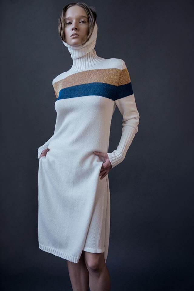 Фантазийная пряжа — хлопок в оплётке из люрекса — придаёт платью ненавязчивоё сияние. Водолазка сделана из хлопка нового поколения, который обеспечивает идеальную пластику, т. е. садится по фигуре.