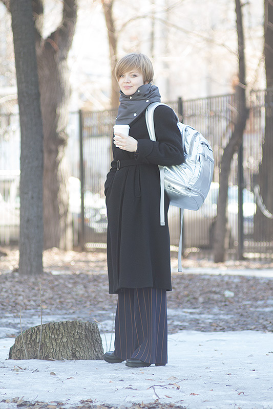 Пальто Cyrille Gassiline, воротник Intro.version, брюки Escada, ботинки Topshop, рюкзак Nike.