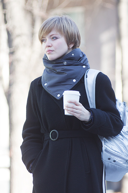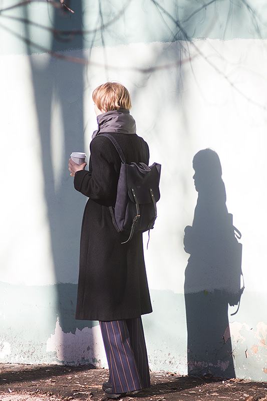 Это и впрямь доспехи интроверта: спину защищает рюкзак, шею — плотный воротник-шарф на кнопках, надетый поверх пальто.