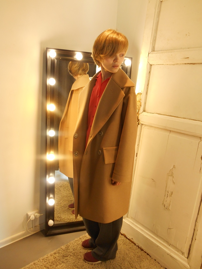 Второй раз в жизни вижу, как коралловый цвет не выглядит бабским. Первый — это был плащ Buttermilk Garments, съёмку с которым я скоро выложу в блоге. И там, и там строгая форма и отсутствие лишних деталей помогают ярче проявиться цвету, форма и цвет усиливают друг друга.