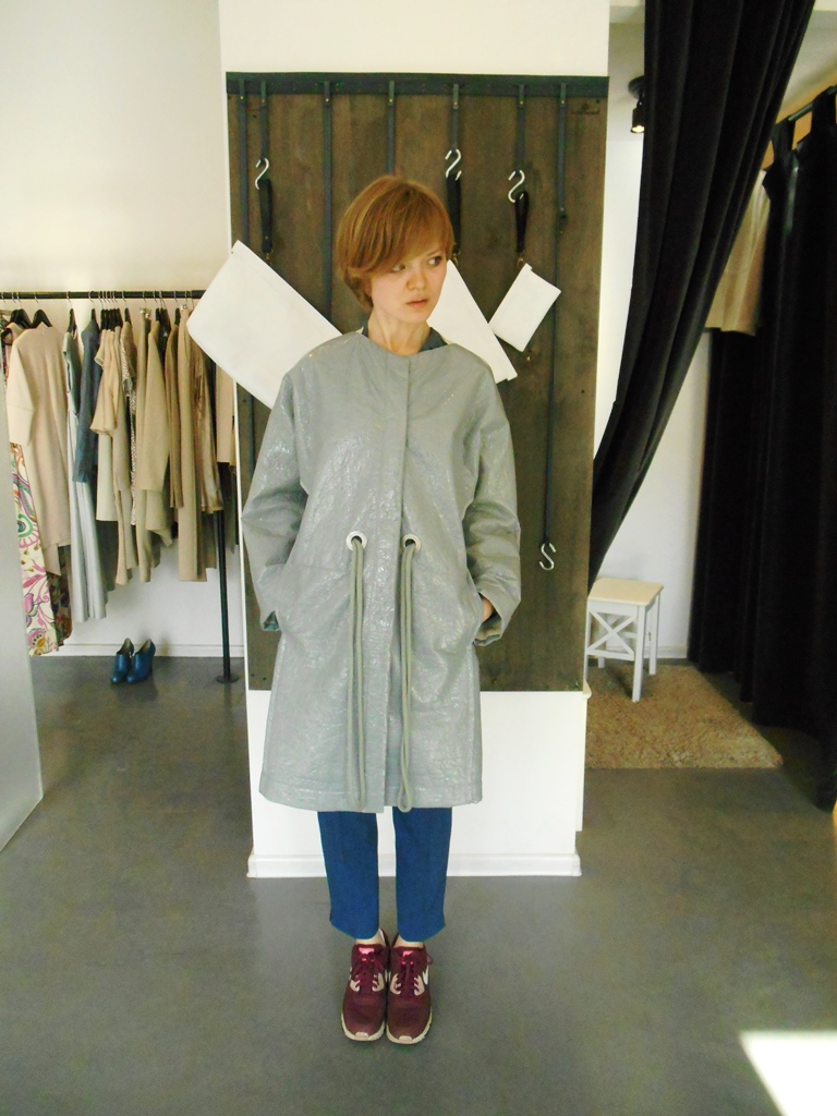 Лаковый плащ давно меня манил, ещё когда я его увидела в весенней раскладке фейсбучной группы Backstage Showroom. Живьем он впечатляет в сто раз сильнее, чем на фото. Лак блестит непошло — думаю, в том числе из-за жатой фактуры и деликатного оттенка. Вещь острохарактерная, конечно, но, думаю, всё же из тех, что спокойно уживаются с остальными. Вот к моему гардеробу, например, этот плащ очень даже подошёл бы. (Тут вспоминается анекдот про «съесть-то он съест, да кто ж ему даст»).