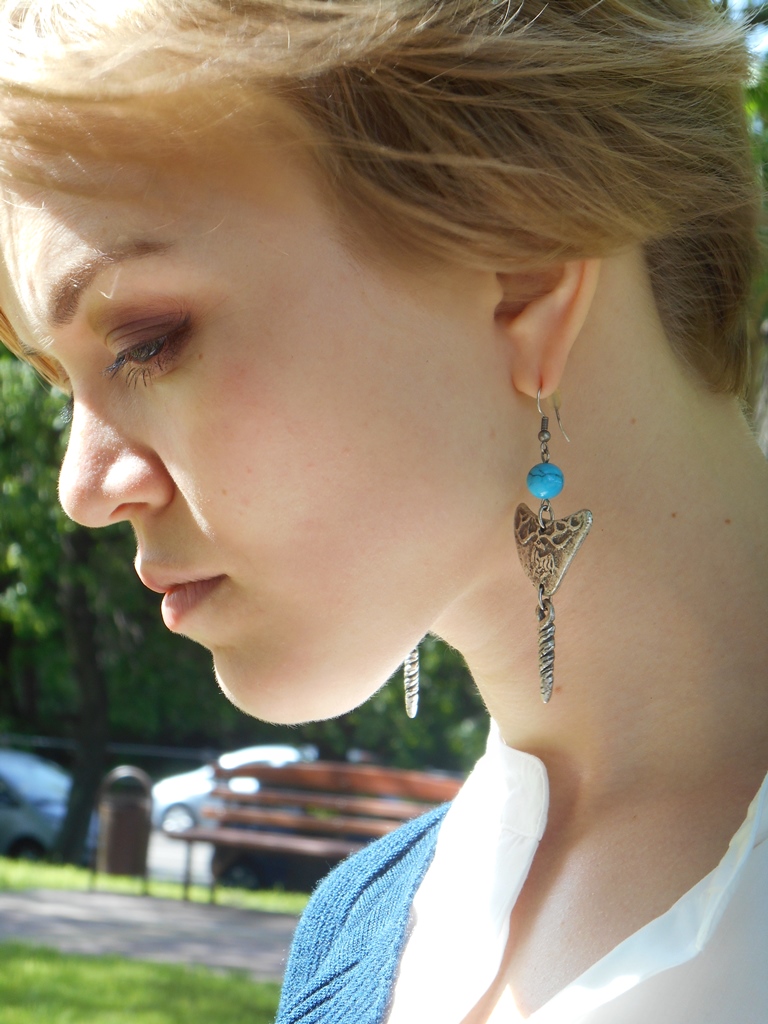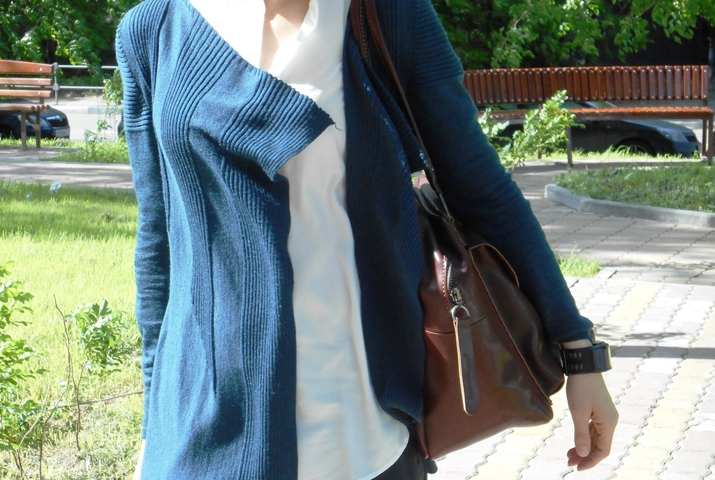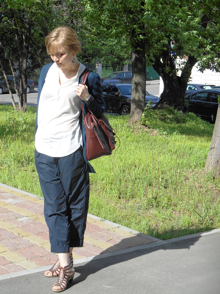 На мне рубашка Uniqlo, кардиган от Ксении Серой (образец, серия была небольшой, и её ещё можно найти в R.E.D.), брюки COS, босоножки Dr.Martens (которые, кстати, со мной уже третий год, а всё не изнашиваются и не надоедают), серьги «Скифская этника».