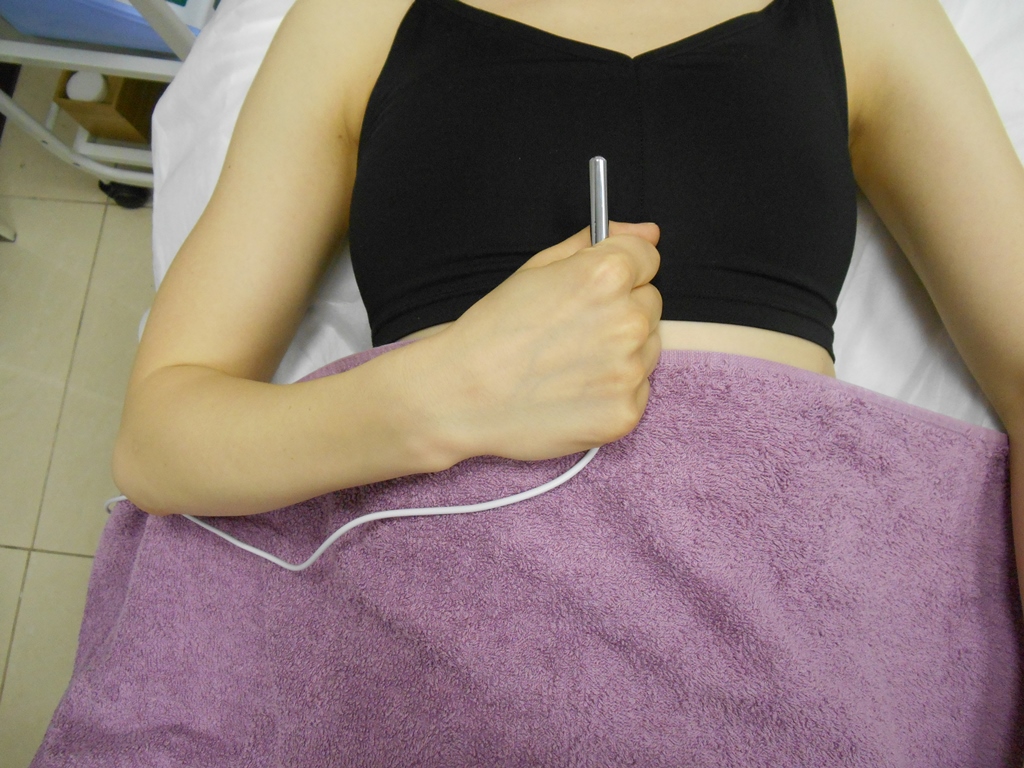 Следующей процедурой была ультразвуковая чистка лица — довольно чувствительная, а в моём случае — даже болезненная, но эффективная. Нос после неё блестел как лакированный, но после того, как кожа успокоилась, я увидела, что черных точек нет и в помине. На фото я держу специальную штуку для заземления.