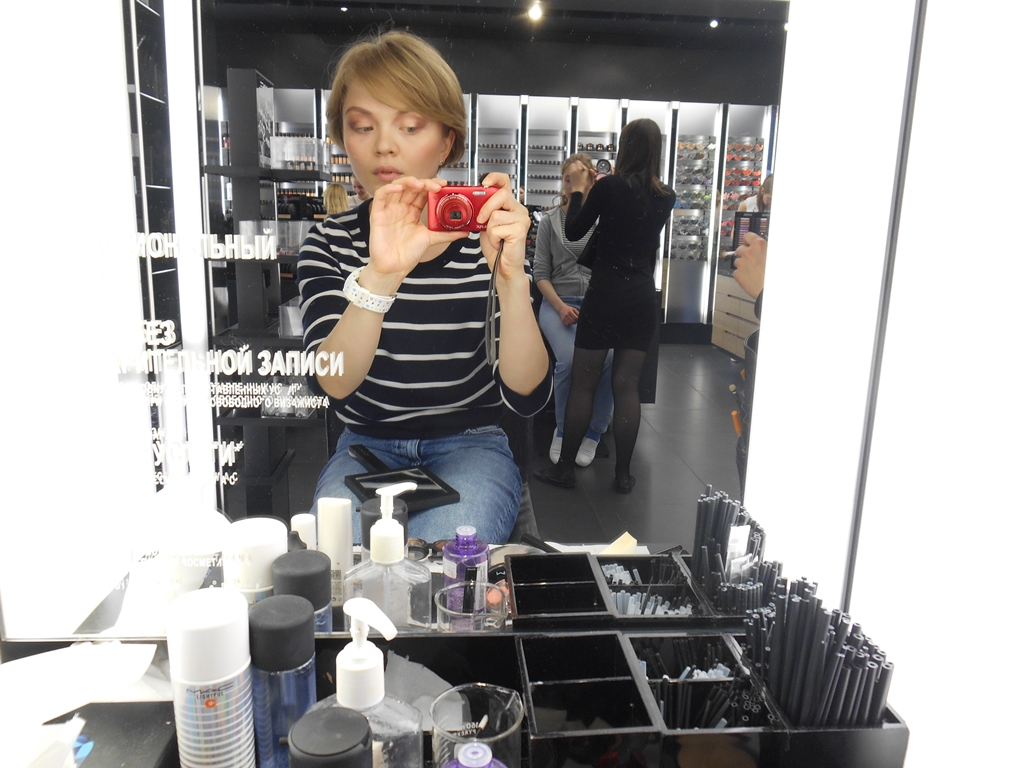 Пока Олеся пошла за подводкой, я фотографирую одну из промежуточных стадий. Кстати, весь урок был построен так: каждый этап Олеся делала на одной половине лица, а я доделывала на другой. Вроде симметрично получилось.