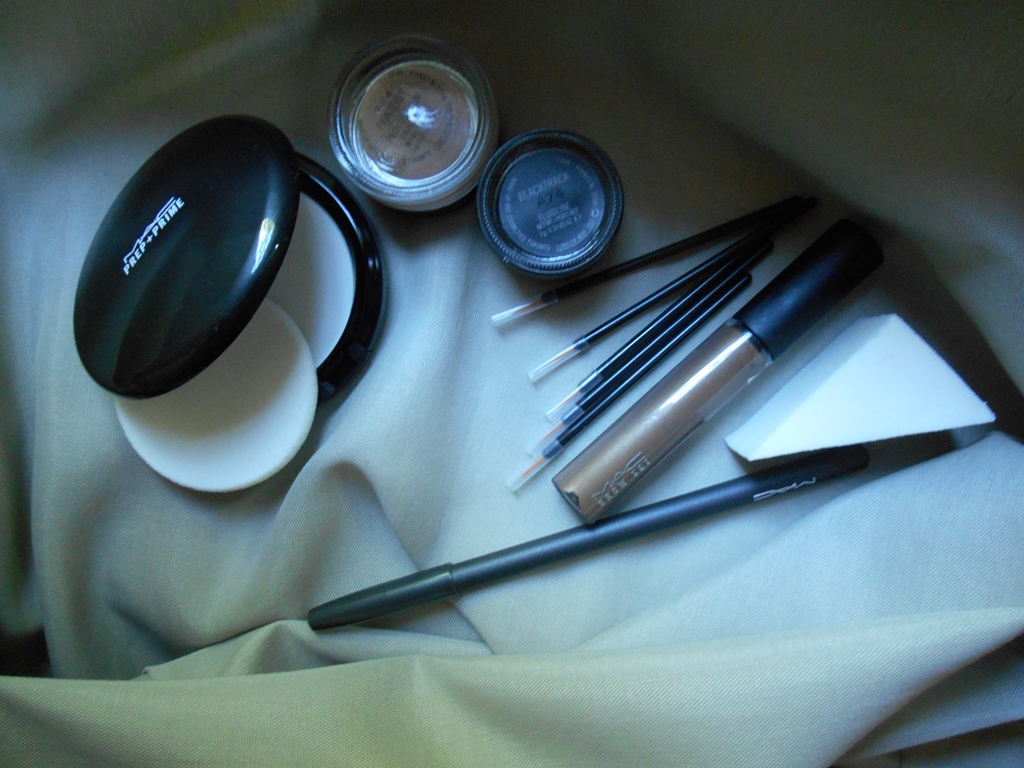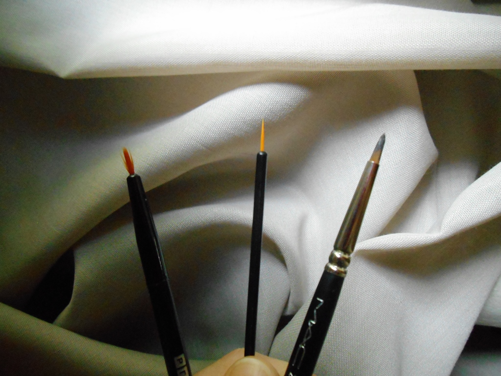 Олеся дала мне с собой несколько одноразовых кисточек, какими они делают макияж в магазине. Это кисть очень тонкая и более упругая, что ли, чем та, что была в моём старом «профессиональном» наборе; вести её ровно не в пример легче. Сравните пластмассовую кисточку из набора детских акварельных красок — и беличью или колонковую кисть, которой на самом деле пишут художники; разница примерно такая же. Я так впечатлилась, что на следующий день пошла купила в M.A.C. 209-ю кисть — она лучшая для подводки, и, когда стала использовать, увидела знакомый по художке эффект: кисть с пигментом от основания постепенно делается тоньше, переходя в 1 волосок на самом кончике. Если у меня раньше были вопросы, почему маковские кисти столько стоят, то после этого они отпали.