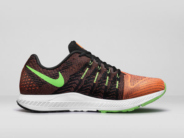 «Nike Air Zoom Elite 8. Самые легкие беговые кроссовки семейства Zoom с воздушной подушкой Zoom Air в передней части стопы. Минимальный перепад высот подошвы (всего 8 мм) позволяет лучше контролировать движение, а легкий бесшовный сетчатый верх с использованием технологии Nike Flywire дает фиксацию и обеспечивает доступ воздуха».