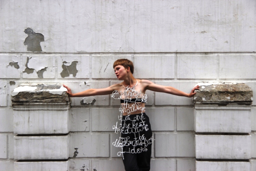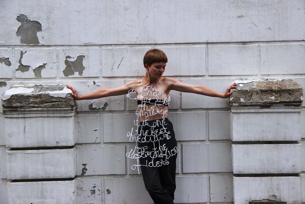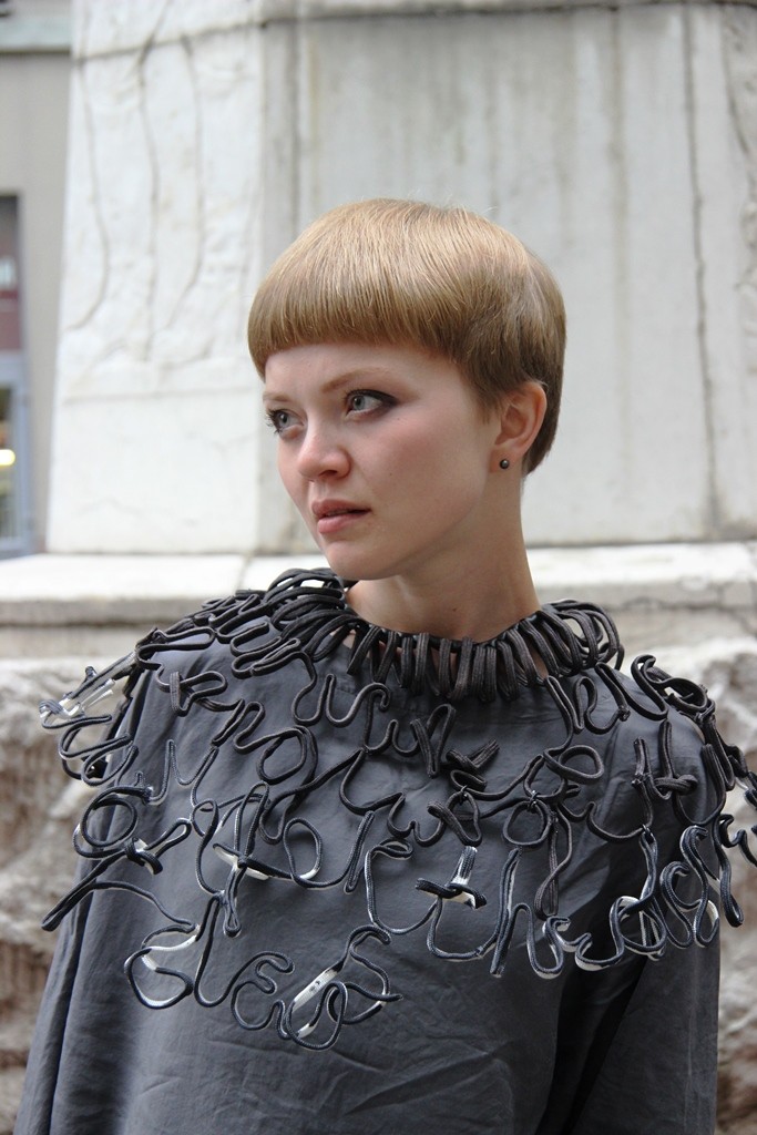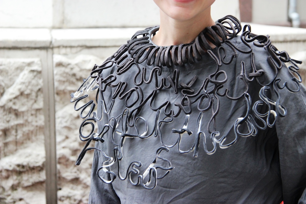 Злата продолжает все свои начатые линии: пиксели, африканские колье с кожей, бусины, — дополняя их новыми предметами. Огромное колье из слов, может быть, на пороге нового тренда; идея украшения-одежды, жесткого хитинового декоративного панциря, вполне может раскачаться и пойти.