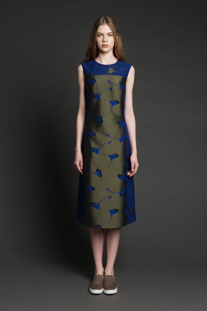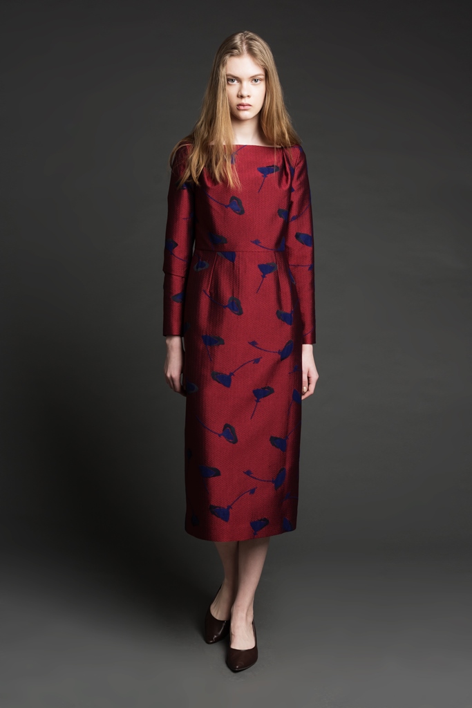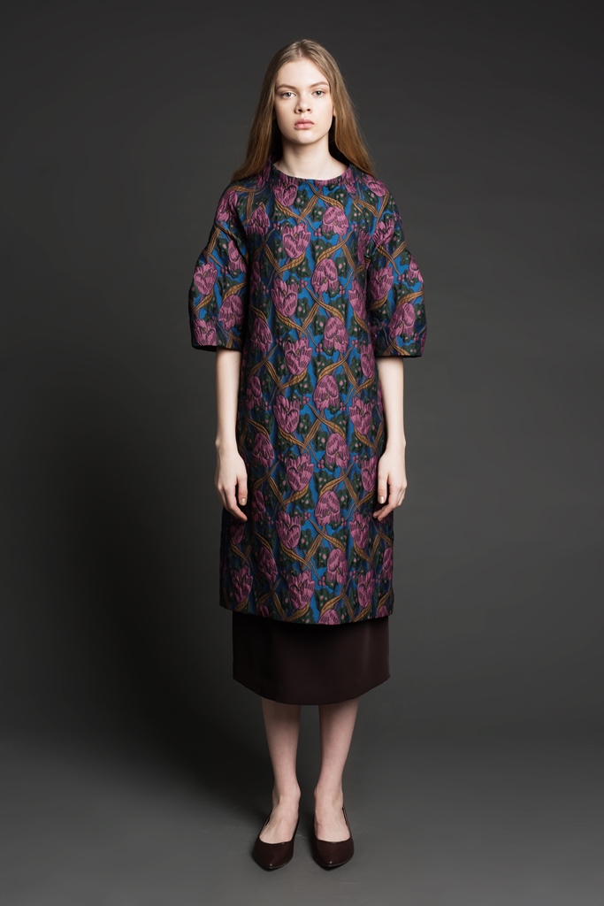 Узнаваемые силуэты на месте; новое — в некотором всё же изменении пропорций. Вот, например, платье, которое мне понравилось больше всего. Вы только посмотрите, что здесь происходит с формой рукава и с общей длиной. Отдельная песня — жаккард.