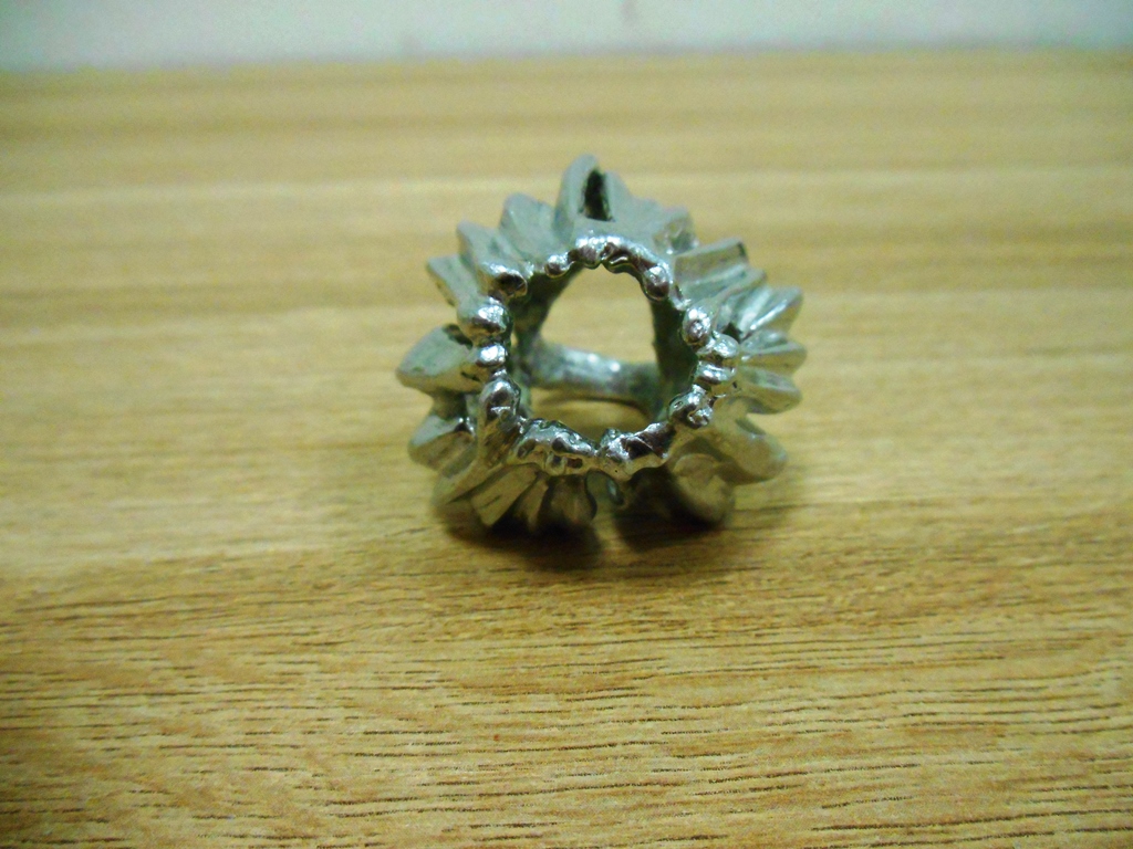 Саша: «Сухоцвет я очень долго делал, это было перед Новым годом в 2013 году. У нее тоже есть история, у этой формы.  Я сначала сделал кристалл из монтажной пены, потом снял силиконовую форму, потом налил туда воск, начал вырезать, и на основе кристалла получилось это кольцо. Это не растение, это полностью абстракция».