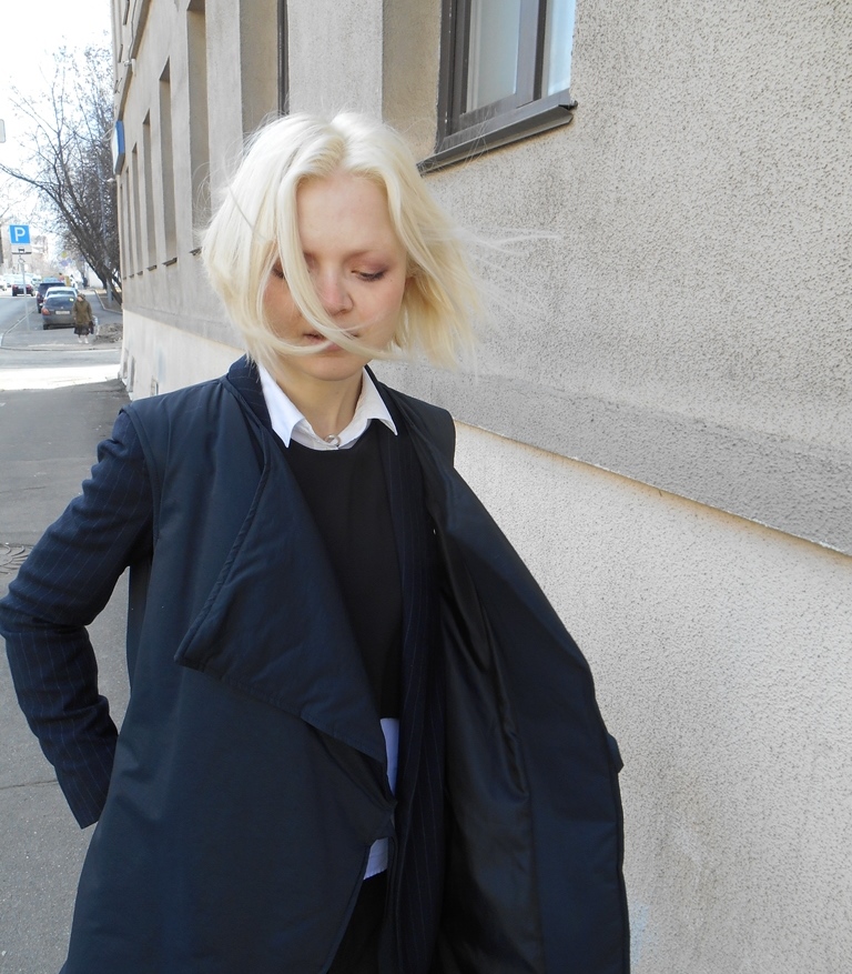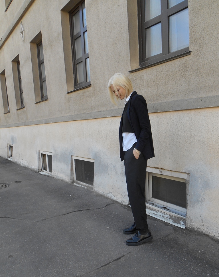 #1: жилет Introversion, топ Ksenia Gerts, пиджак Mango, брюки Pull&Bear, рубашка Uniqlo, ботинки Dr. Martens.