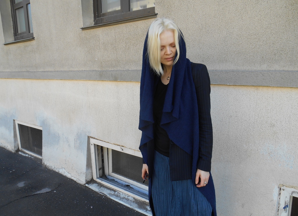 Жилет Людмилы меняет впечатление от облика на раз. Если вы вышли из дома в джинсах-майке-пиджаке, а надо зачем-то смягчить мальчуковость (мне вот бывает иногда надо, не знаю как вам), жилет изменит силуэт нужным образом. А если надеть капюшон, свободные полы ложатся библейскими складками.