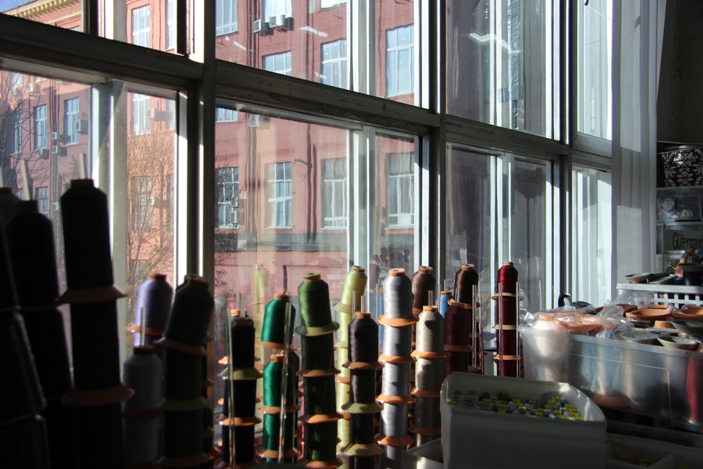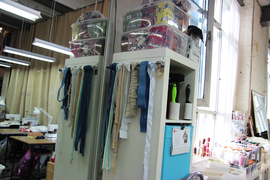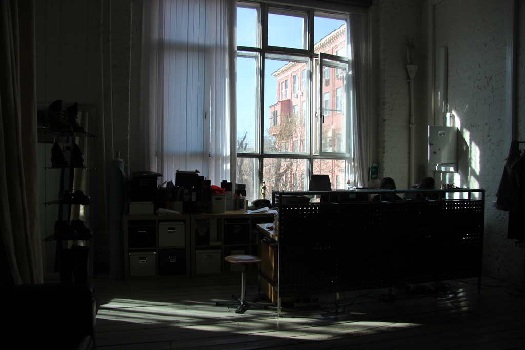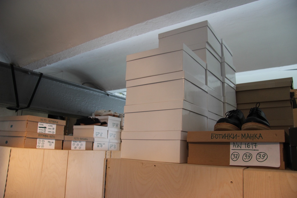 Обувь придумывают тоже здесь. Гардины можно открыть, и за ними будет склад ткани.