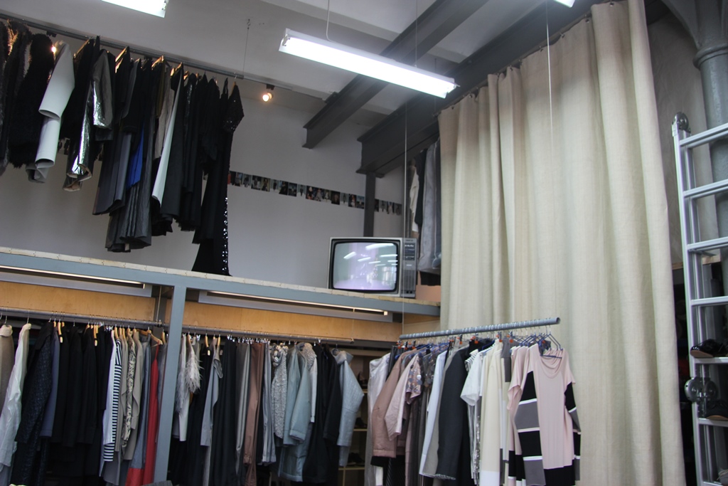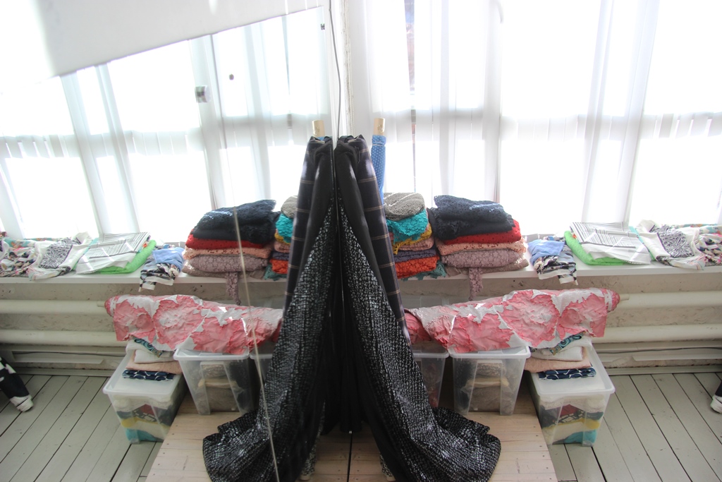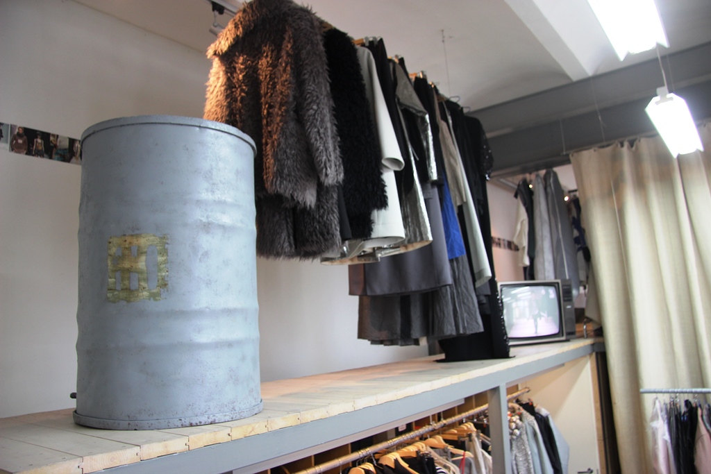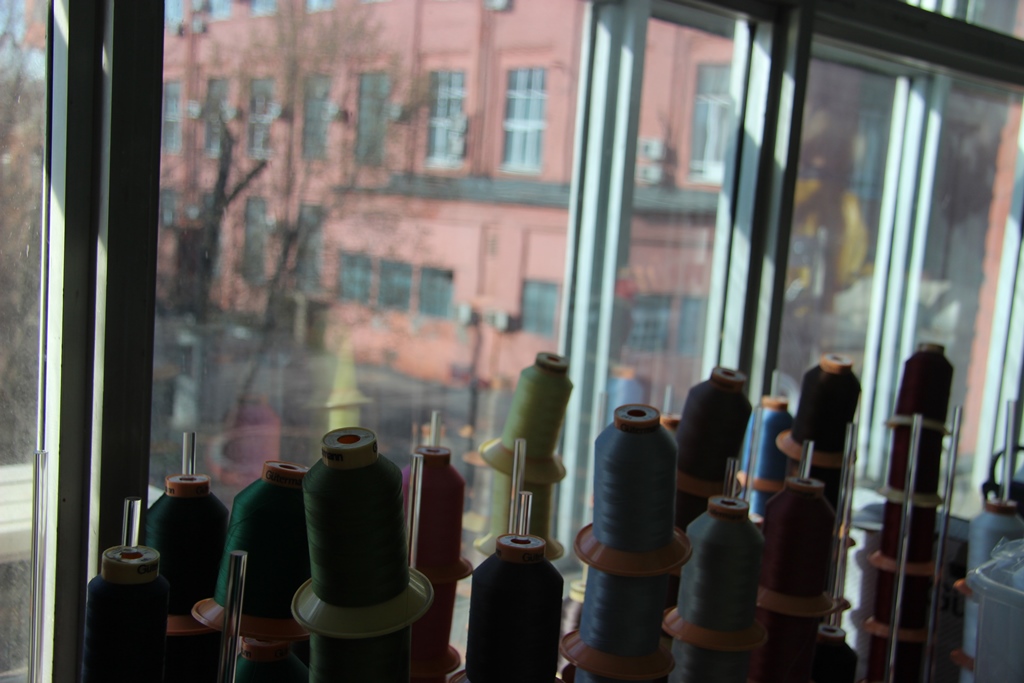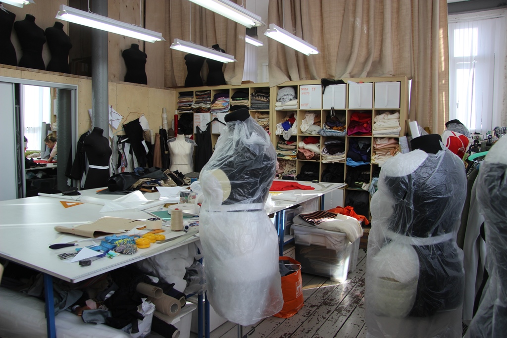 Обувь придумывают тоже здесь. Гардины можно открыть, и за ними будет склад ткани.