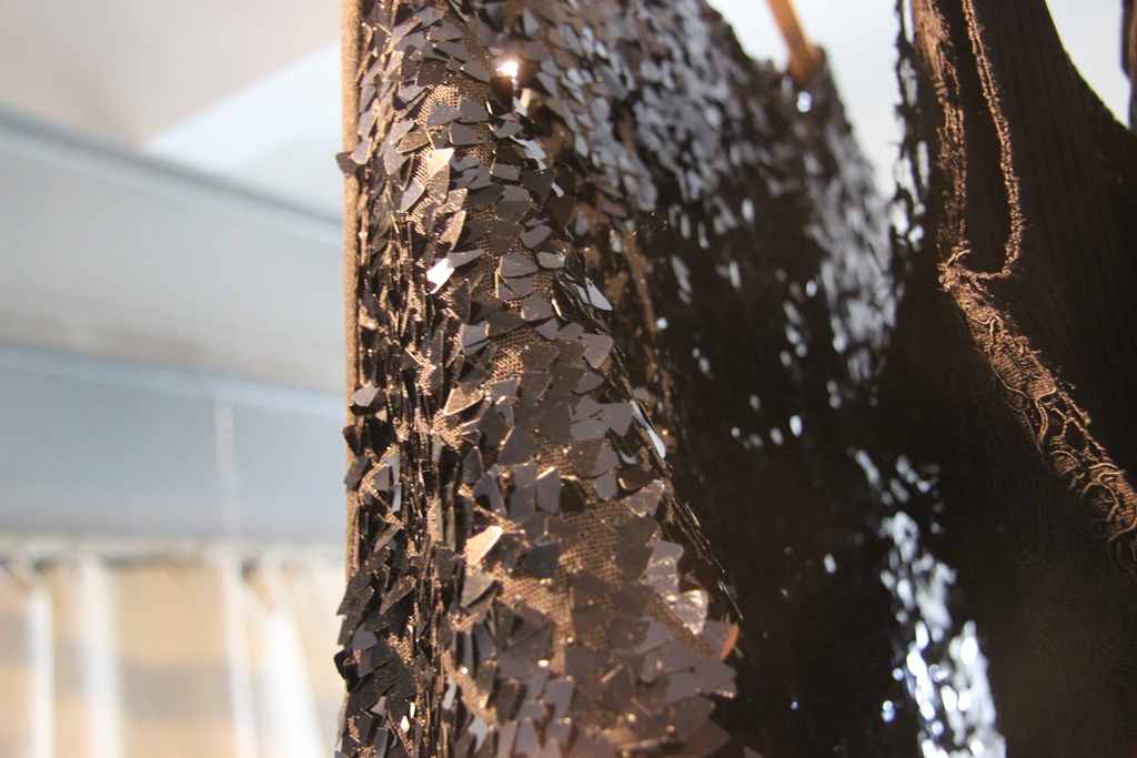 Чешуйки принадлежат чёрному платью с пайеточной спиной.