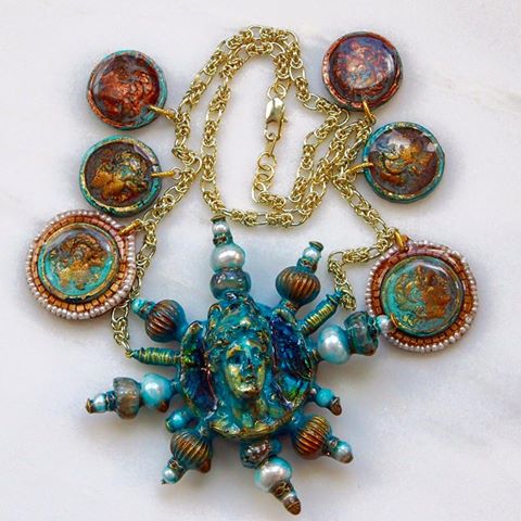 Даша и Виталий делают разные штуки: Виталий — узнаваемые броши-головы, Даша — морских коньков и украшения, где есть стекло. Материалы они используют в том числе безумно дорогие — покупают, например, в Индии готовые цацки из золота с необработанными алмазами, разламывают их и вставляют в свою бижутерию. Люблю такое. Правда, стоит такая голова, с бирюзой, лазуритом и алмазами, каких-то нереальных денег. Это первая линия, как они сами иронично её называют; а то можно выбрать серьги из стекла, тоже очень красивые.