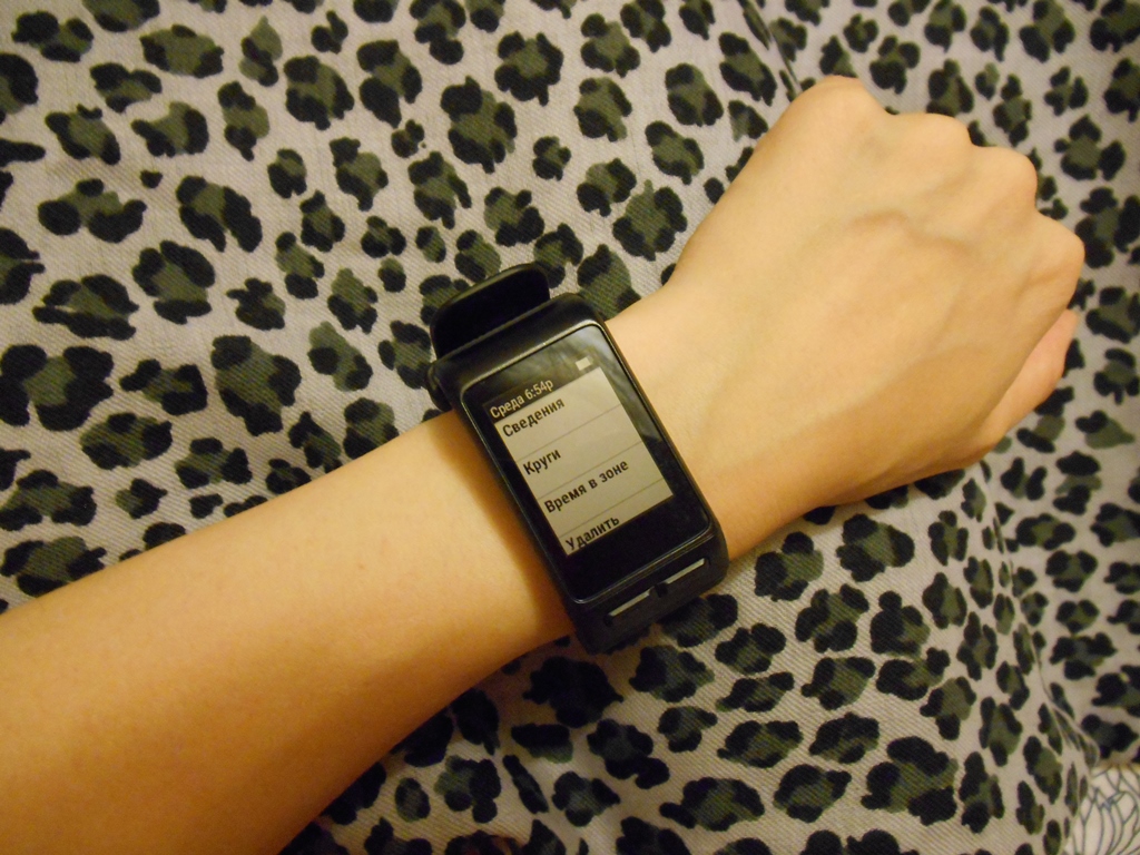 Не умею я фотографировать во время движения, так что придется вам поверить на слово 🙂 Во время пробежки на экране отображается расстояние, общее время, темп. Если сделать слайд вниз, покажется время круга (километра), расстояние круга, пульс. Каждый километр, если у вас настройки по умолчанию, часы жужжат и показывают время, за которое пройден километр. Для меня это совершенно бесценная функция на забегах, и я никогда её не убираю ни из каких часов.