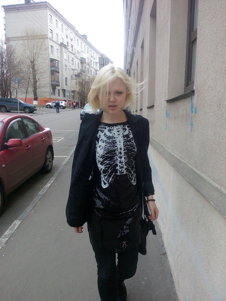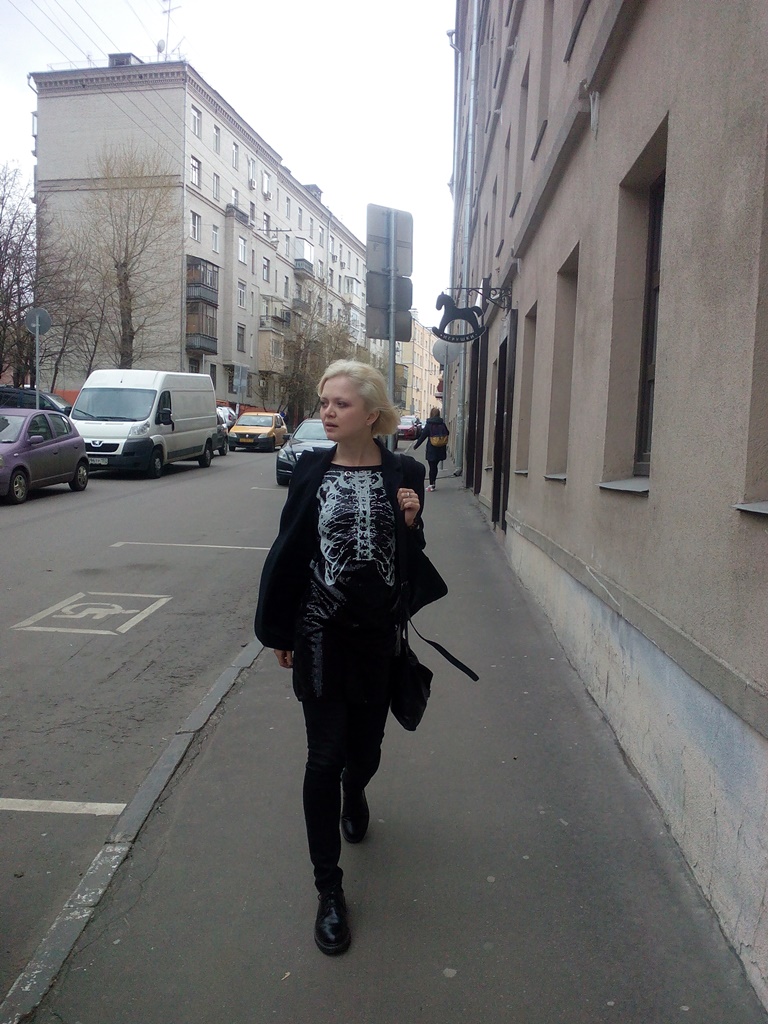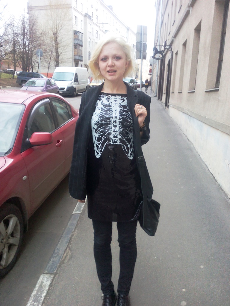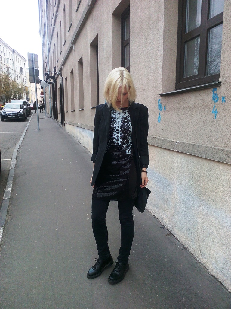 Поэтому если платье с рентгеном грудной клетки, думала я, то точно НЕ с косухой. Офисный костюм, скромный тёмный кэжуал — можно попробовать. И выбрала универсальный пиджак в меловую полоску и черные джинсы скинни, сумку с портфельными замочками от Максима Шарова, плюс самые простые низкие мартенсы мужского пошиба.