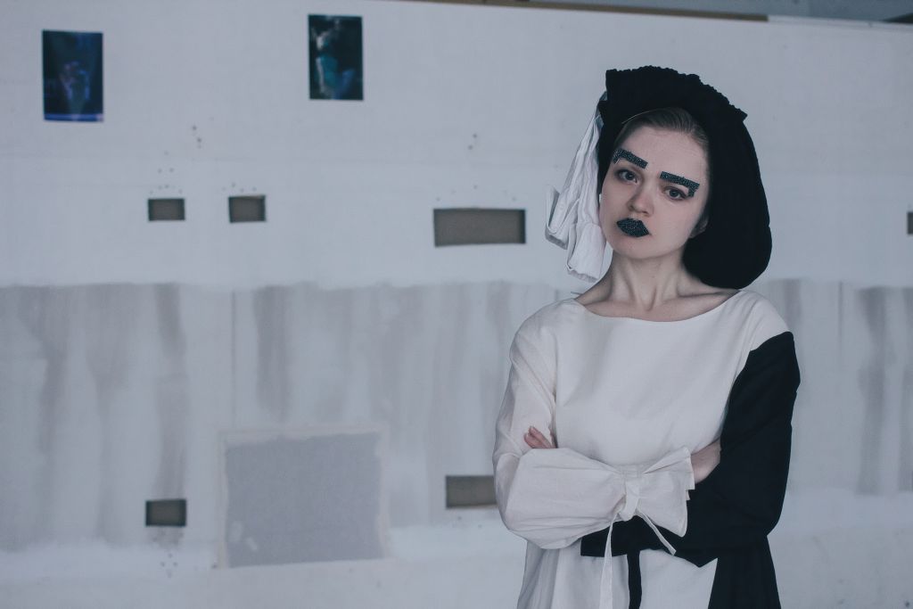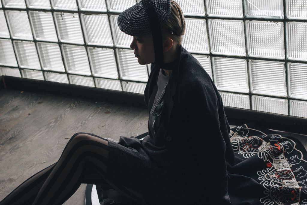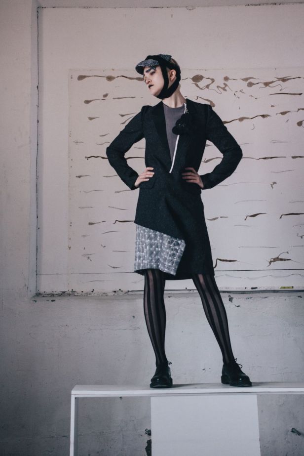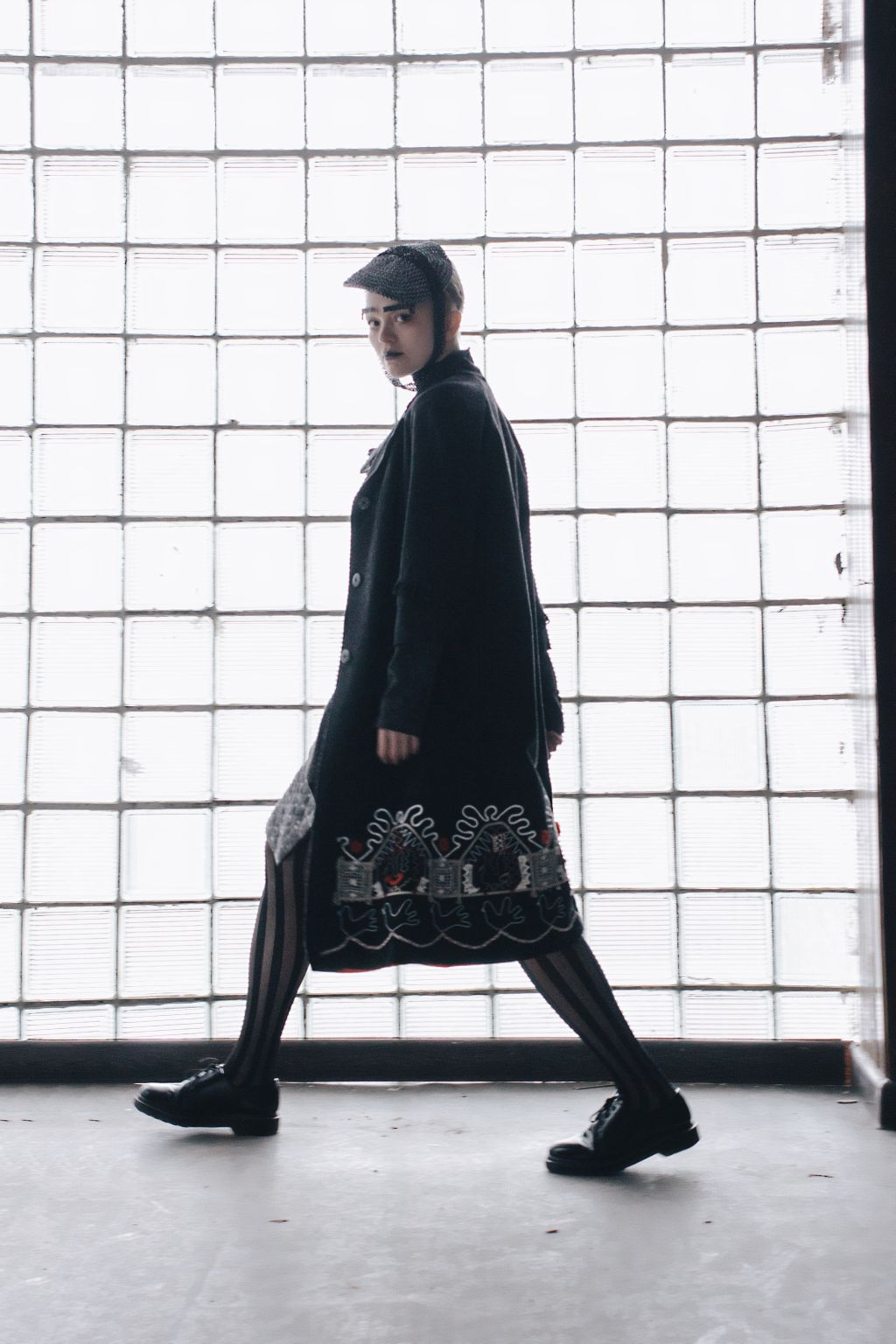 Пальто Razu Mikhina, платье и шарф Natasha Drigant, платье Chisto, брелок-Чебурашка Maxim Sharov, шляпка Zlata Peczkowska, бисерный шарф из «Дивы», колготки Monki, ботинки Dr/Martens.