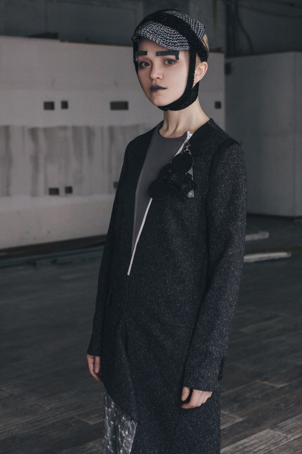 Вещи нашлись почти сразу. Кто у нас за костюмные детали? У Наташи Дригант была отличная коллекция как раз про это, с платьями, сделанными как костюм — манишка выглядела как гвоздиками прибитая, самое нужное впечатление. На моё счастье, вещь нашлась в архиве (а также шарф с рубашечными рукавами). Аппликации-домики есть почти буквально такие же в зимней коллекции Дарьи Разумихиной 2000/01, но в итоге мы использовали пальто из коллекции 2007/08 года.