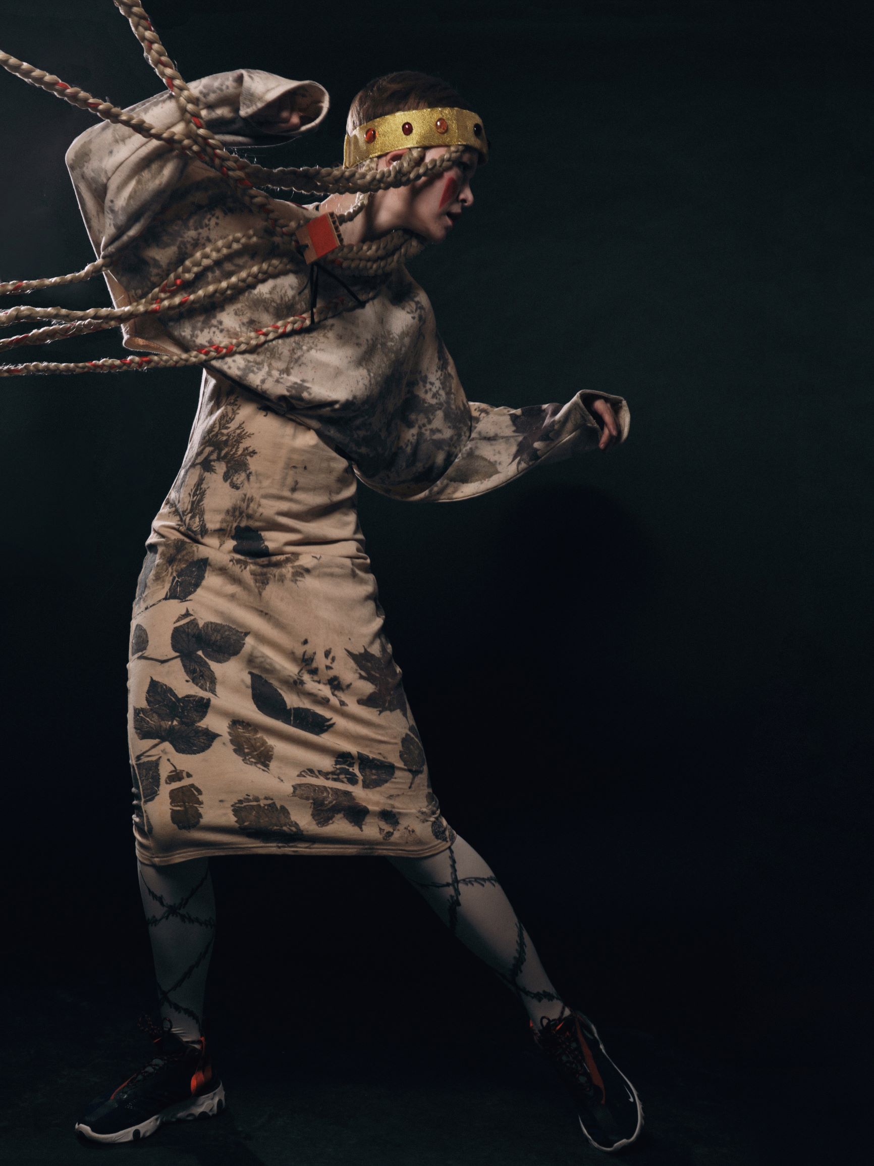 С обувью было легко, с костюмами тоже: костюм мужика я знала где взять — у Ксении Серой как раз был замечательный костюм на мальчика, с древнерусскими буквами («Весна» из эпохи глубоко дописьменной, но это ладно). Рубаха Избранной — это платье и укороченный свитшот Intro.version (очень кстати оказались Асины эксперименты с эко-окрашиванием).