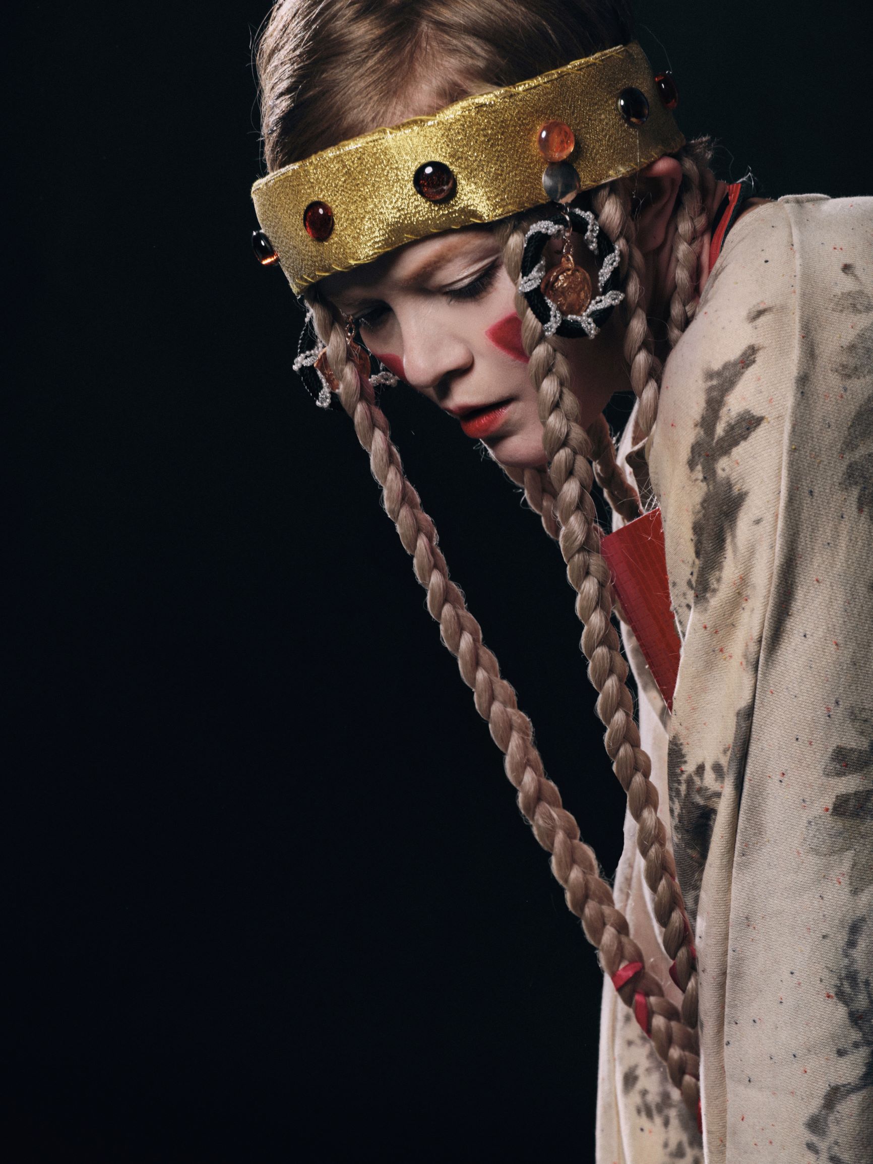 (Со шкурой, кстати, не совсем удобно вышло. Сначала я хотела взять второй образ — старейшину-медведя, у которого голова зверя закрывает его собственную. Решила бы заодно и проблему с макияжем для мужика. Стала искать шкуру в аренду; нашла море! предложений продажи от всяких охотничьих контор. Нашла и одну аренду: натуральный медведь, 10 т.р., Питер. Все это не подходило. Попросила друзей; мне быстро подсказали человека, человек ответил, и все уже было готово, но тут я решила обсудить съемку с Диной.