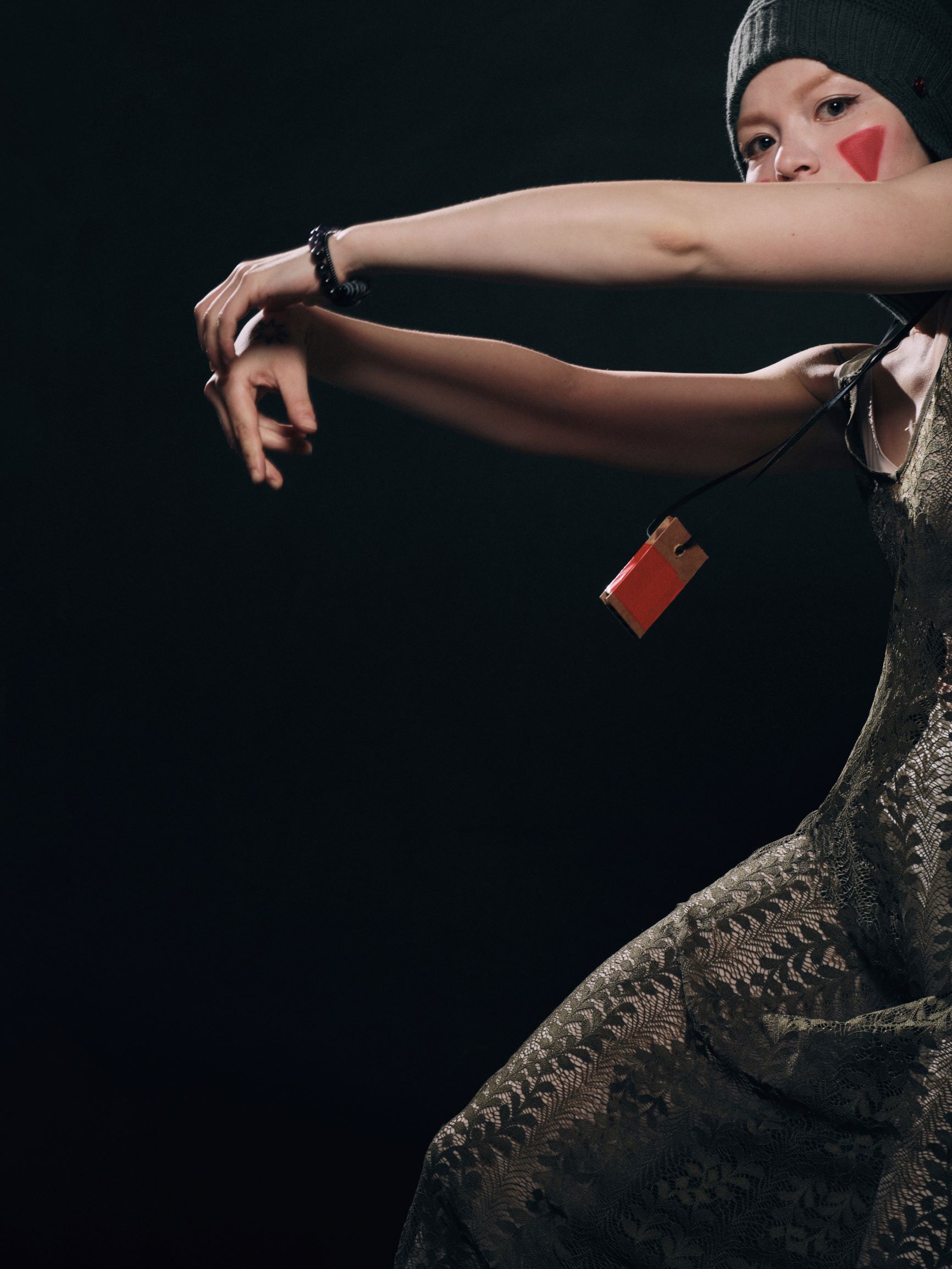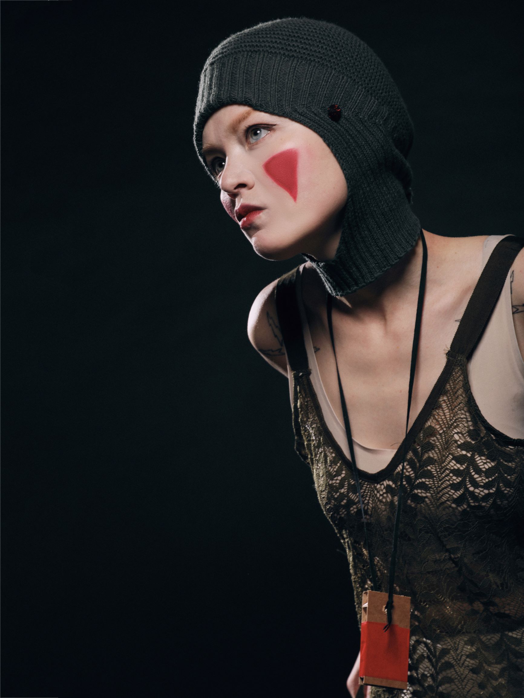 Зеленый образ, третий на самом деле — после мужского, появился из шапки-балаклавы Ольги Огненко. Кружевной сарафан, похожий на маскировочную сетку, нашелся сам собой. Тут я снова, как в предыдущем образе, использую как украшение организаторский бейдж с показа Юлии Николаевой.